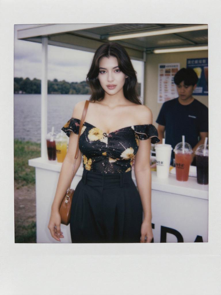 A lean woman in a polaroid instant camera style, wearing a black off-shoulder floral top with yellow splashes and short ruffled sleeves, paired with relaxed high-waist black trousers. She carries a rounded leather shoulder bag and stands at a smoothie stand by a lake. Sexy. Pretty face and beаutiful eyes. Big breasts