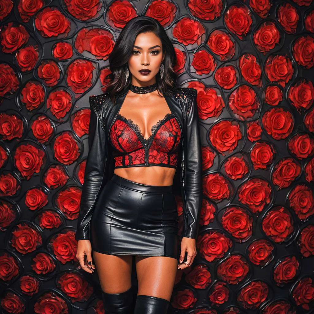 Portrait of a woman with broad shoulders wearing a high waist black leather mini skirt and a sheer red lace bralette with black leather accents. She has long dark hair styled in side-swept waves, accessorized with a lace choker and hoop earrings, standing against a decorative red-lit background.
