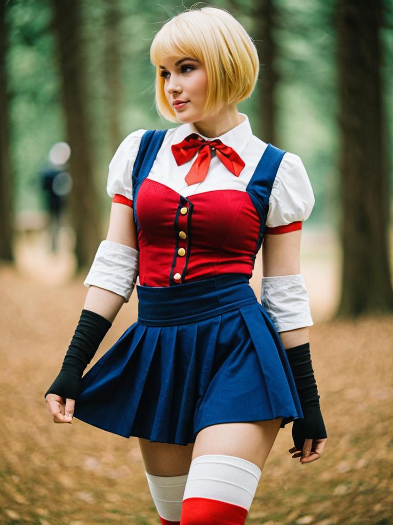 Photo-realistic cosplay photo of person in ashelia b'nargin dalmasca costume. 1girl, short hair, blonde hair, thighhighs, miniskirtlifestyle stock photo, shallow depth of field, lifestyle stock photography, shallow depth of field, natural lighting, warm tones, soft background blur, candid moments, vibrant colors, realistic textures, modern casual clothing. full body shot