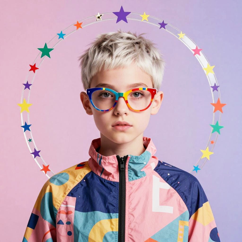 This digital artwork features a stylized portrait of girl with pixie cut platinum hair and hexagonal blue sunglasses, centered within a minimalist silver hexagonal frame with subtle etching. A soft gradient background in harmonious dusty pinks and steely greys, gentle vignette, balanced symmetry. Wearing a denim jacket with bright digital print patches. Modern and colorful fusion of folk art and contemporary design; crisp edges, subtle paper grain, painterly accents, high detail, studio quality.