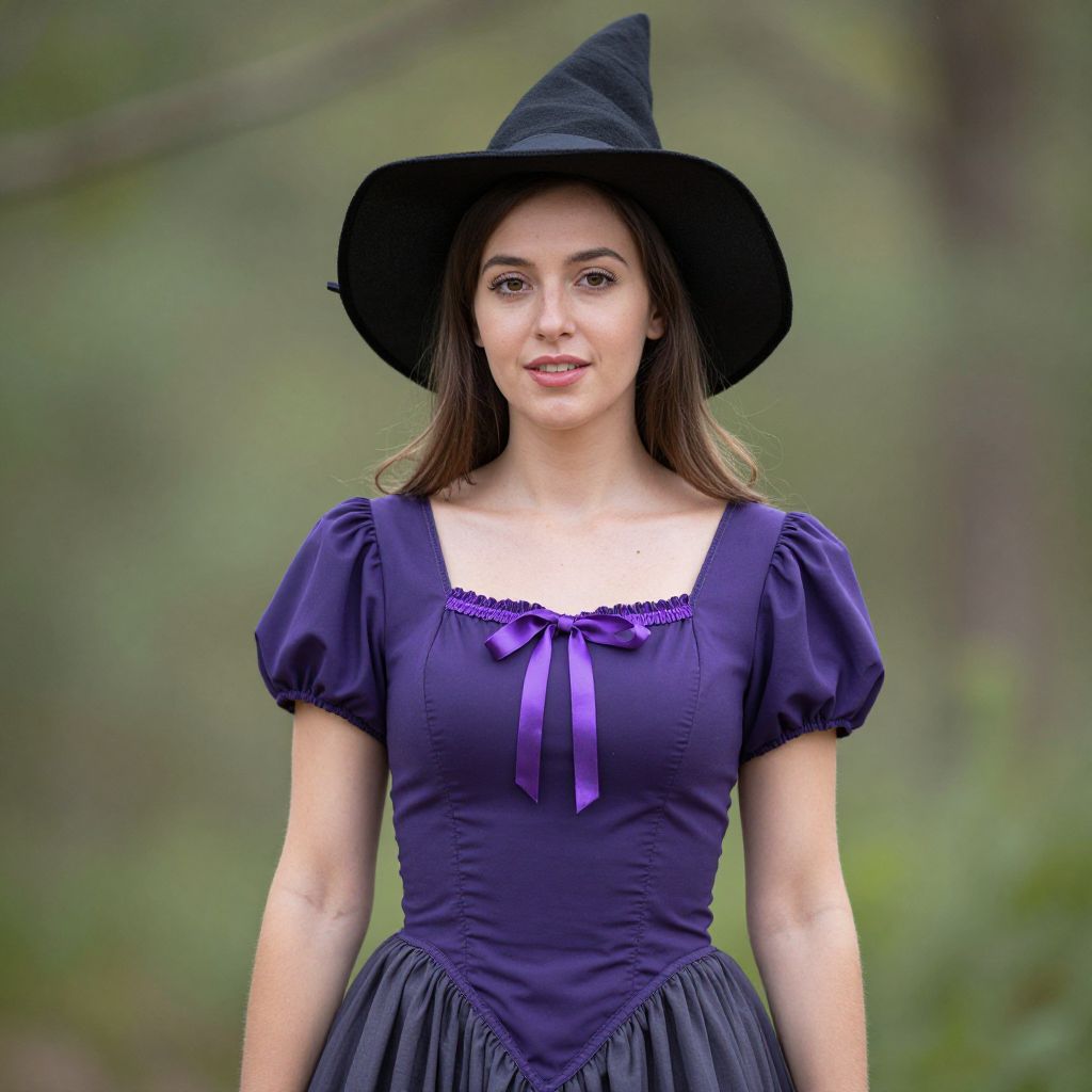 Photograph of a young woman with light skin and brown hair, wearing a black witch hat and a deep purple, short-sleeved, Victorian-style dress with puffed sleeves and a purple ribbon bow at the neckline. She has a slight smile and is standing against a blurred, green forest background. Her dress has a fitted bodice and a flared skirt. The image has a soft focus, highlighting her face and attire while the background remains slightly out of focus. She has a slender build and is looking directly at the camera.
