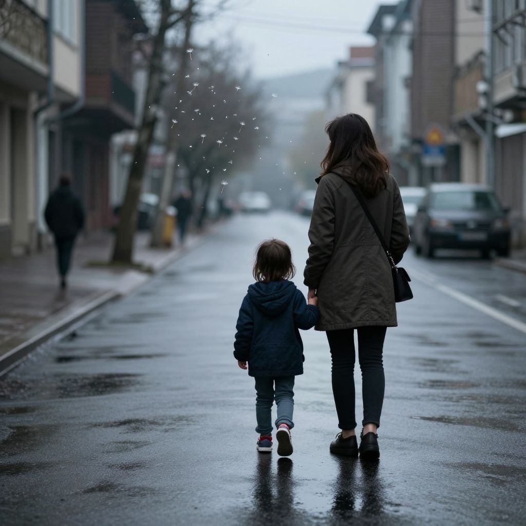 Dandelion seeds drift gracefully above a quiet urban street as a woman and child stand together, their silhouettes reflected in the wet pavement, evoking a serene yet poignant atmosphere where emotions seem to manifest in the air and on the ground.