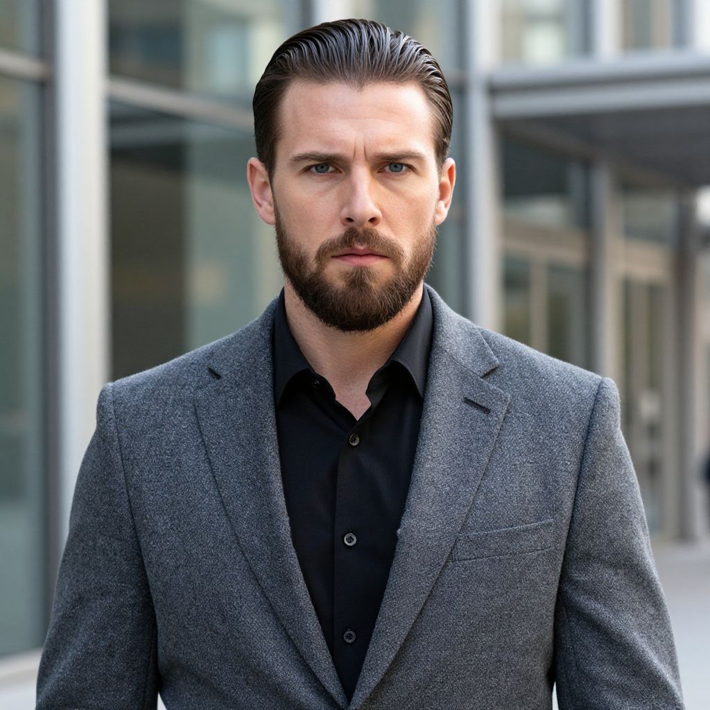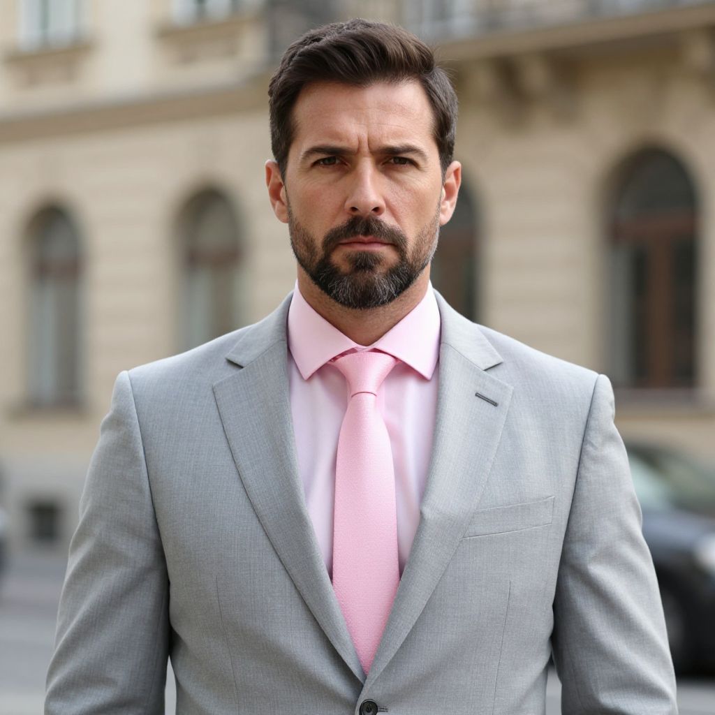 Photograph of a handsome, middle-aged man with short, dark brown hair and a neatly trimmed beard. He's wearing a light gray suit with a pink dress shirt and matching pink tie. The suit is well-fitted, and he has a serious expression. The background shows a blurred, beige building with arched windows, suggesting an urban setting. The lighting is bright, highlighting his face and suit.