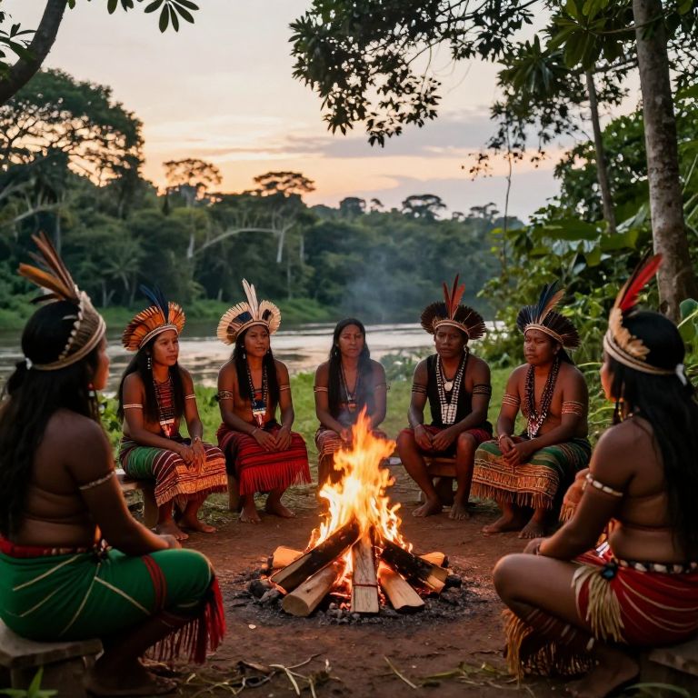 A diverse group of Indigenous people from the Amazon rainforest sitting around a campfire at sunset, wearing traditional garments including feathered headdresses and woven textiles, with deep green and red patterns, the background showing dense jungle canopy and distant rivers, natural lighting, realistic photography style.