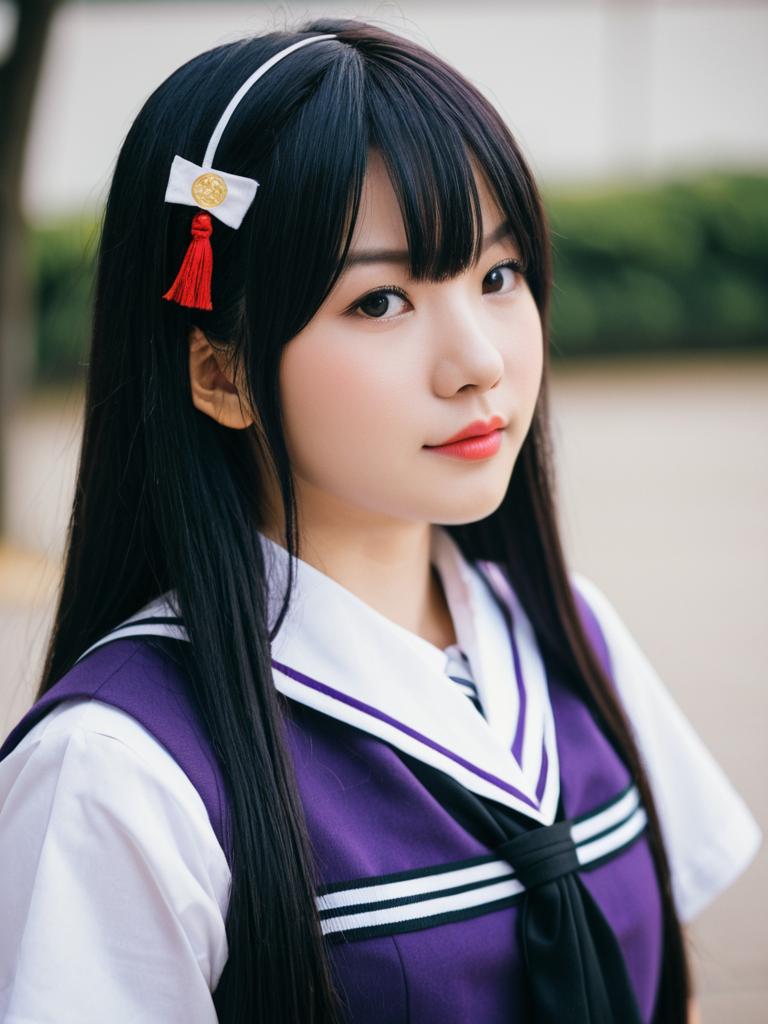 Photo-realistic portrait of a young Asian woman with long black hair wearing an Aihara Mei school uniform costume. The outfit includes a purple and white sailor-style school uniform with a maroon tie and an emblem badge. The image highlights natural lighting, shallow depth of field, and realistic textures, capturing vibrant colors and a soft blurred background.