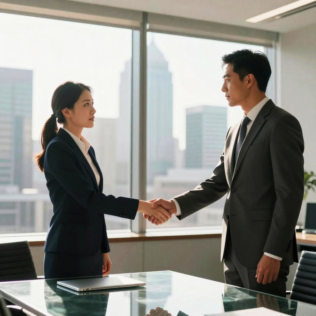 Negotiate scene in a modern corporate office, two professionals shaking hands across a glass table, sunlight streaming through large windows, sleek city skyline visible outside, tense but hopeful atmosphere, digital art style with sharp details and warm tones