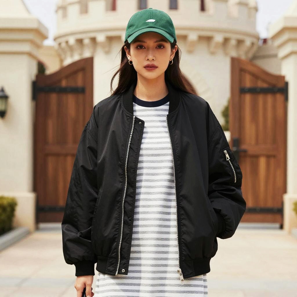 A toned woman in casual streetwear, wearing a grey and white striped jersey dress with a layered black bomber jacket and a green baseball cap, standing in a castle courtyard with wooden gates, styled in the visual aesthetic of hakusensha. Sexy. Pretty face and beutiful eyes