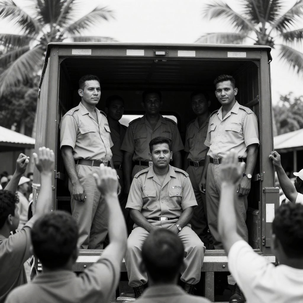 Black-and-white photograph of a large group of men in worn, dirty clothing and berets, standing outdoors. Three men in the foreground have intense expressions, with one hand on hip. Background includes wooden buildings and many more men. Sunlight highlights ures of clothing and faces.