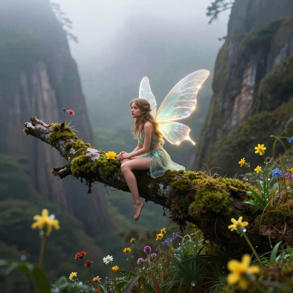Mistymountainfairy perched on a moss-covered branch amidst ancient foggy mountain peaks, delicate glowing wings shimmering softly, ethereal light filtering through dense mist, enchanting forest atmosphere with vibrant wildflowers and sparkling dew drops, fantasy realm.