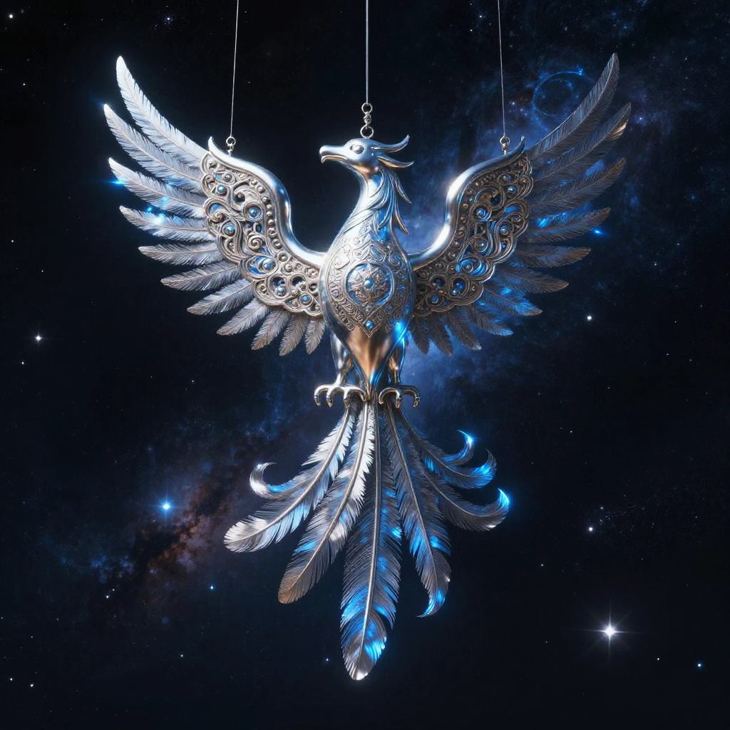 Faravahar symbol crafted in shining metal, suspended in a dark cosmic space filled with stars and nebulae, glowing blue and silver hues, ethereal and spiritual aura, delicate ornamental wings and tail feathers, surreal and futuristic art style.