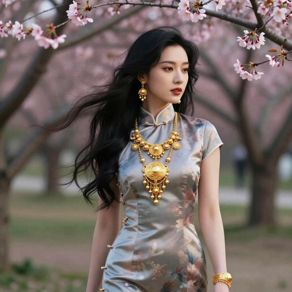 Sexiest Chinese woman with flowing black hair, wearing intricate gold jewelry and a modern qipao, standing in a serene garden with cherry blossoms, vibrant colors, artistic lighting
