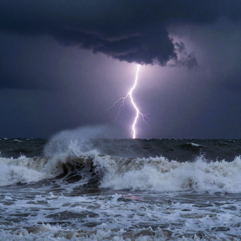Dramatic lighting digital art of a stormy ocean with lightning striking, waves illuminated with glowing accents and deep shadows enhancing the turbulent energy
