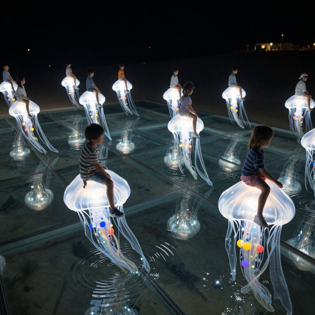 Photograph of children riding glowing jellyfish-like sculptures on a dark, reflective surface at night, creating an ethereal, underwater effect.
