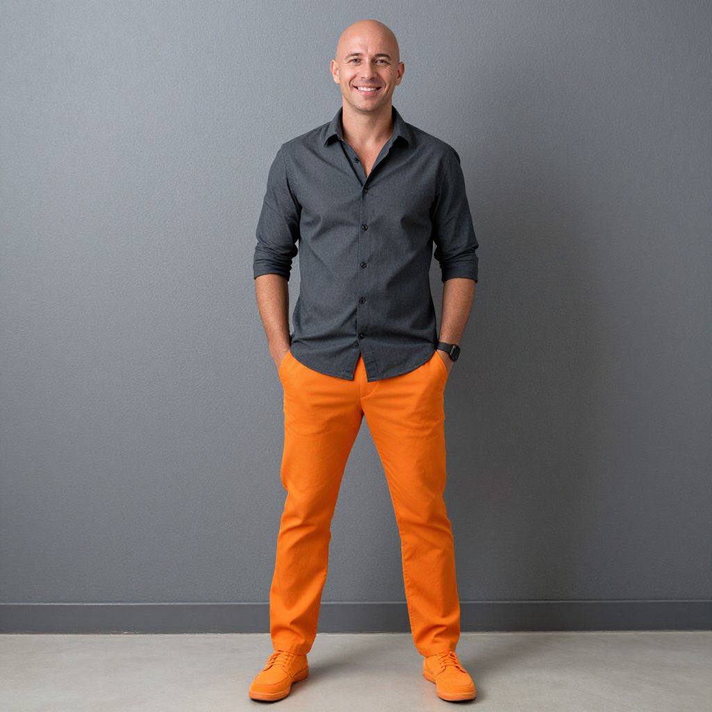 Photograph of a bald, smiling man standing against a plain gray wall. He wears a dark gray, long-sleeved, button-up shirt with the top button undone and bright orange pants. His hands are in his pockets, and he wears matching orange shoes. The shirt is slightly wrinkled, and the pants are fitted. The floor is a light gray concrete, and the lighting is even, eliminating shadows. The overall style is casual and modern. The man's skin tone is light, and he exudes a confident, approachable demeanor.