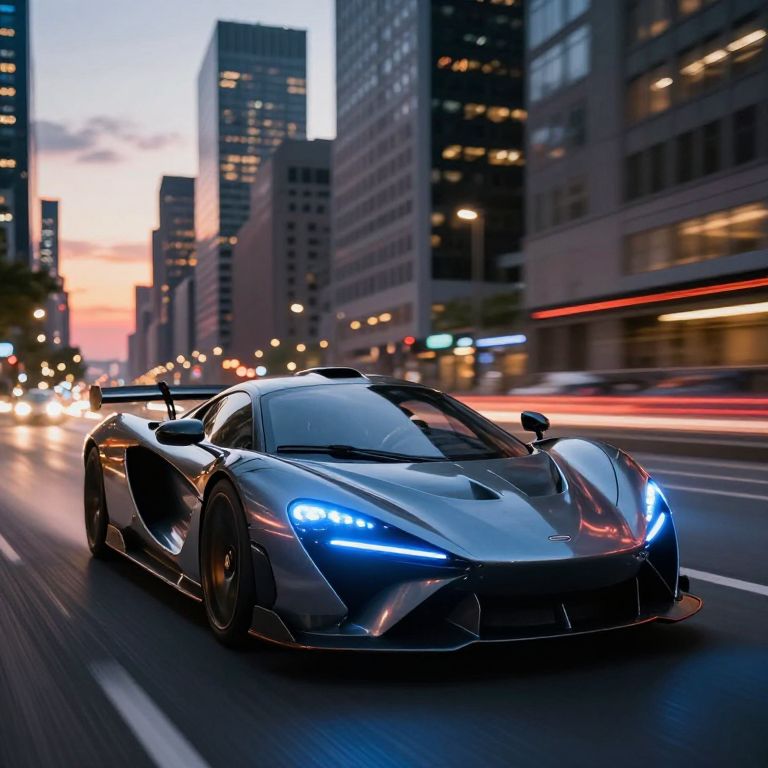 The image depicts a sleek, futuristic supercar racing through a cityscape at high speed. The car, with its aerodynamic design and glowing blue headlights, is positioned in the foreground, seemingly in motion, as suggested by the blurred lights and streaks of light in the background. The car's body is a mix of dark and metallic hues, with intricate details and a rugged texture, giving it a powerful and dynamic appearance. The cityscape behind the car features tall buildings with illuminated windows, creating a vibrant and bustling urban environment. The sky is a mix of warm and cool tones, with the sun setting or rising, casting a dramatic light over the scene. The overall composition is dynamic, with the car and the cityscape interacting in a way that conveys a sense of speed and excitement.