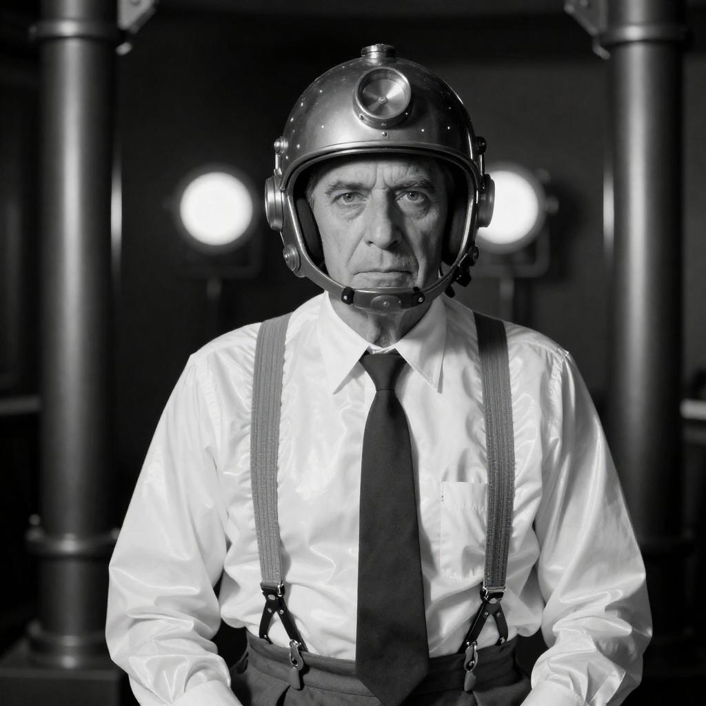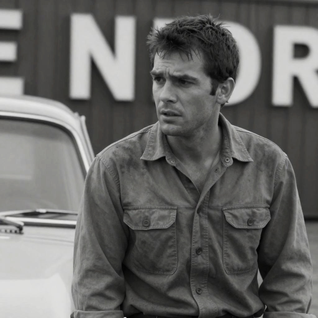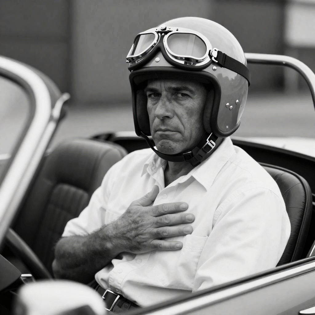 Black-and-white photograph of a middle-aged man with a serious expression, wearing a vintage racing helmet with goggles, white shirt, and a hand on his chest. He is seated in the driver's seat of a classic car. Background includes a blurry, industrial setting. Man's left hand holds a cigarette.