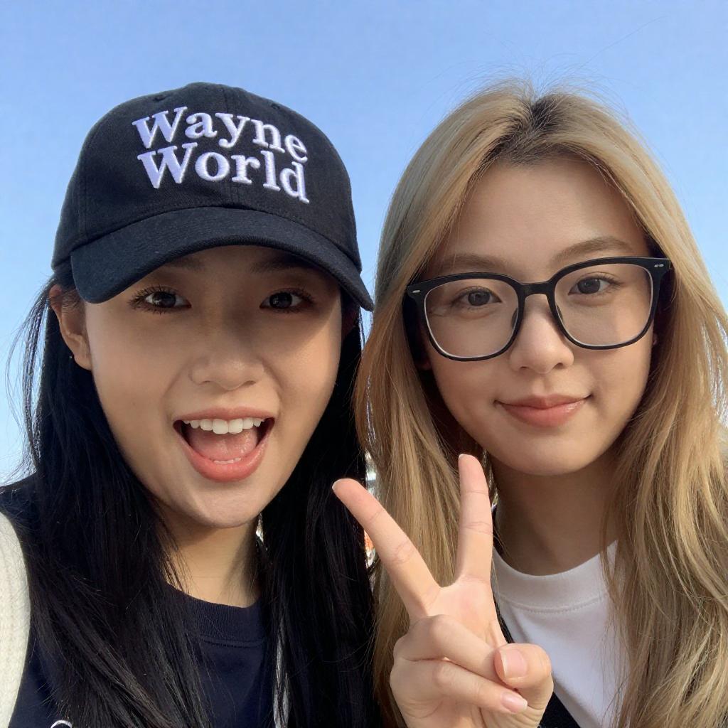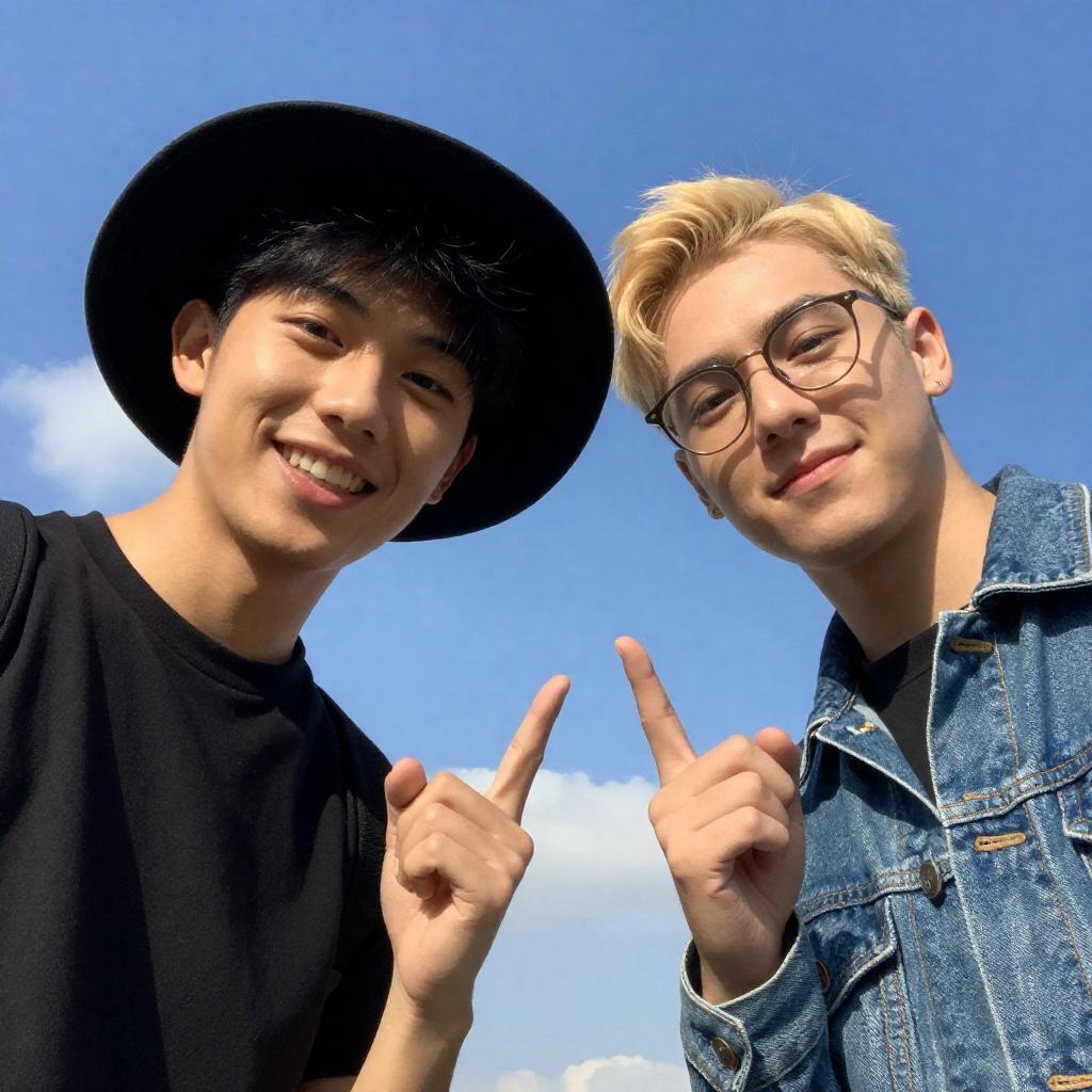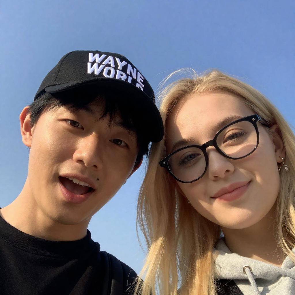 Close-up photo of a smiling young Asian man and woman against a blue sky with clouds. The man wears a black cap with white detailing and a black shirt, grinning widely. The woman has blonde hair, black-rimmed glasses, a white top, and is making a peace sign with her fingers. Bright and cheerful outdoor setting.