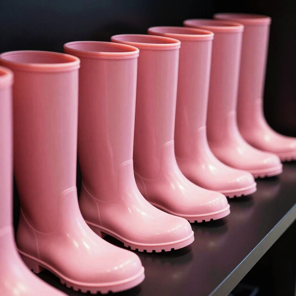 Row of pink latex boots displayed on a reflective black surface, studio shot, sharp focus, dramatic shadows, ultra modern design, bold color saturation