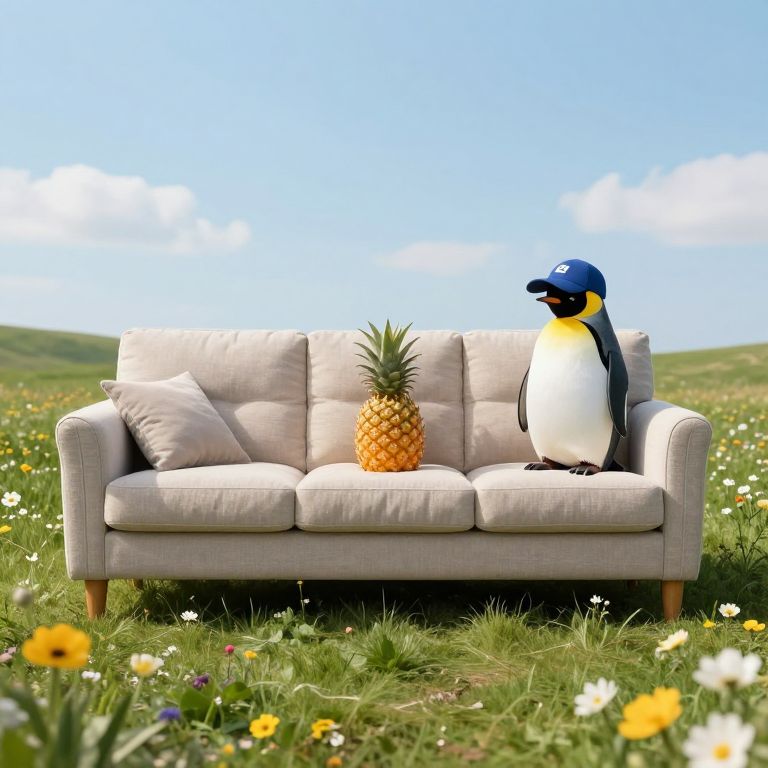 A stunning yet dadaistic photo of a cozy, untouched sofa stands in a meadow with some springflowers, On the soft cushions of the sofa is a burning pineapple, a penguin with baseballcap stands beside the sofa