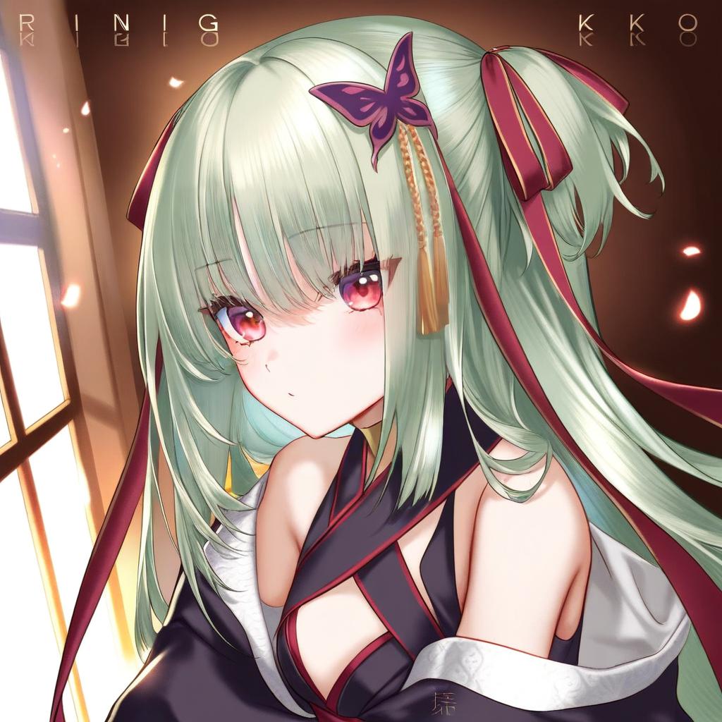 Digital anime-style portrait of a young woman with long, mint-green hair, adorned with a purple butterfly hairclip and red ribbons. She has large, red eyes and a serious expression. She wears a black and white traditional Japanese kimono with red accents, revealing her shoulders. The background is a softly lit, dark room with a window on the left, casting warm light. The word "RINISUKO" is displayed in white, uppercase letters at the top. The overall mood is serene yet slightly mysterious.