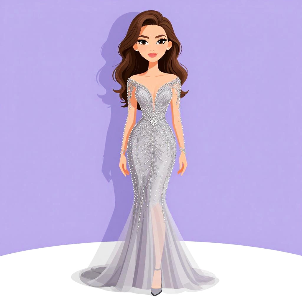 Digital illustration of a fair-skinned woman with long brown hair in a white, off-shoulder, lace-embellished wedding gown, standing