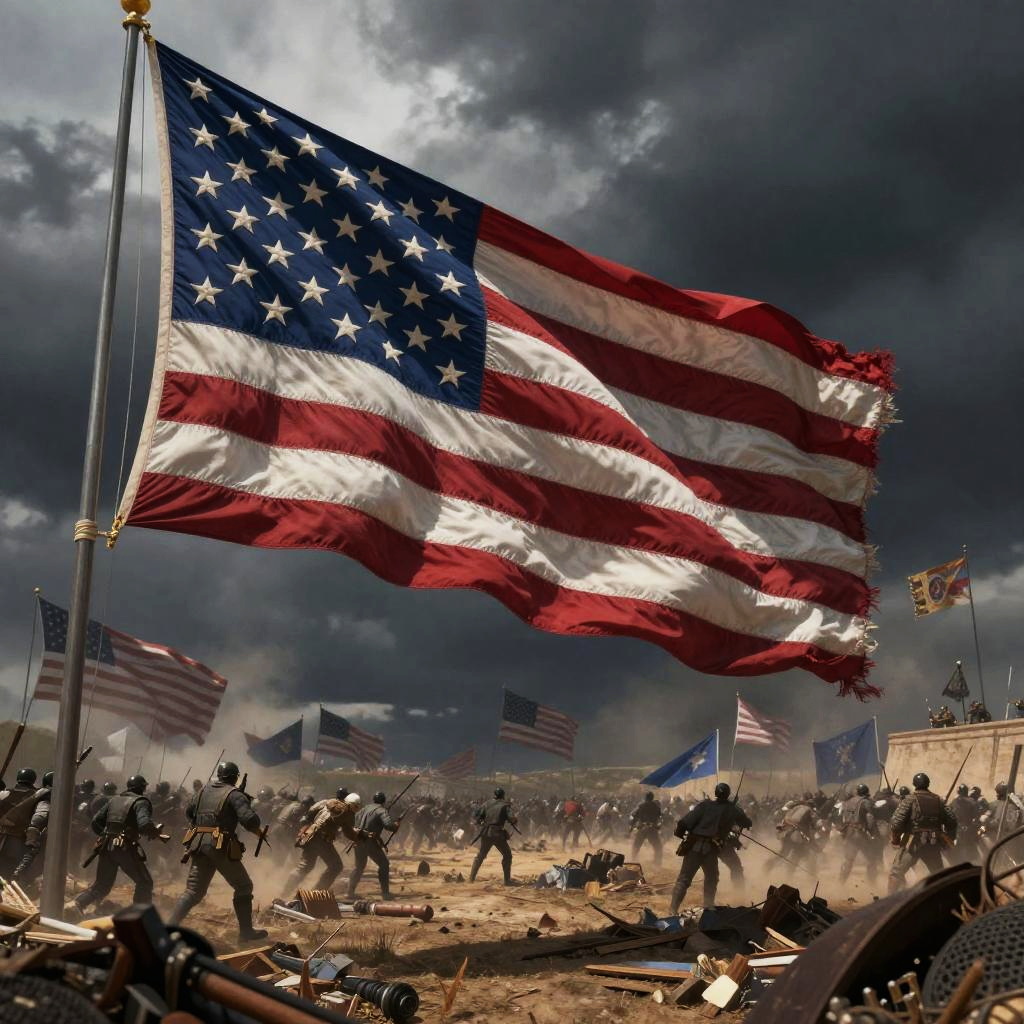 US empire flag unfurled over a sprawling alternate history battlefield, blending traditional stars and stripes with imperial motifs, dark moody sky, intense shadows, highly detailed, dramatic and epic scene.
