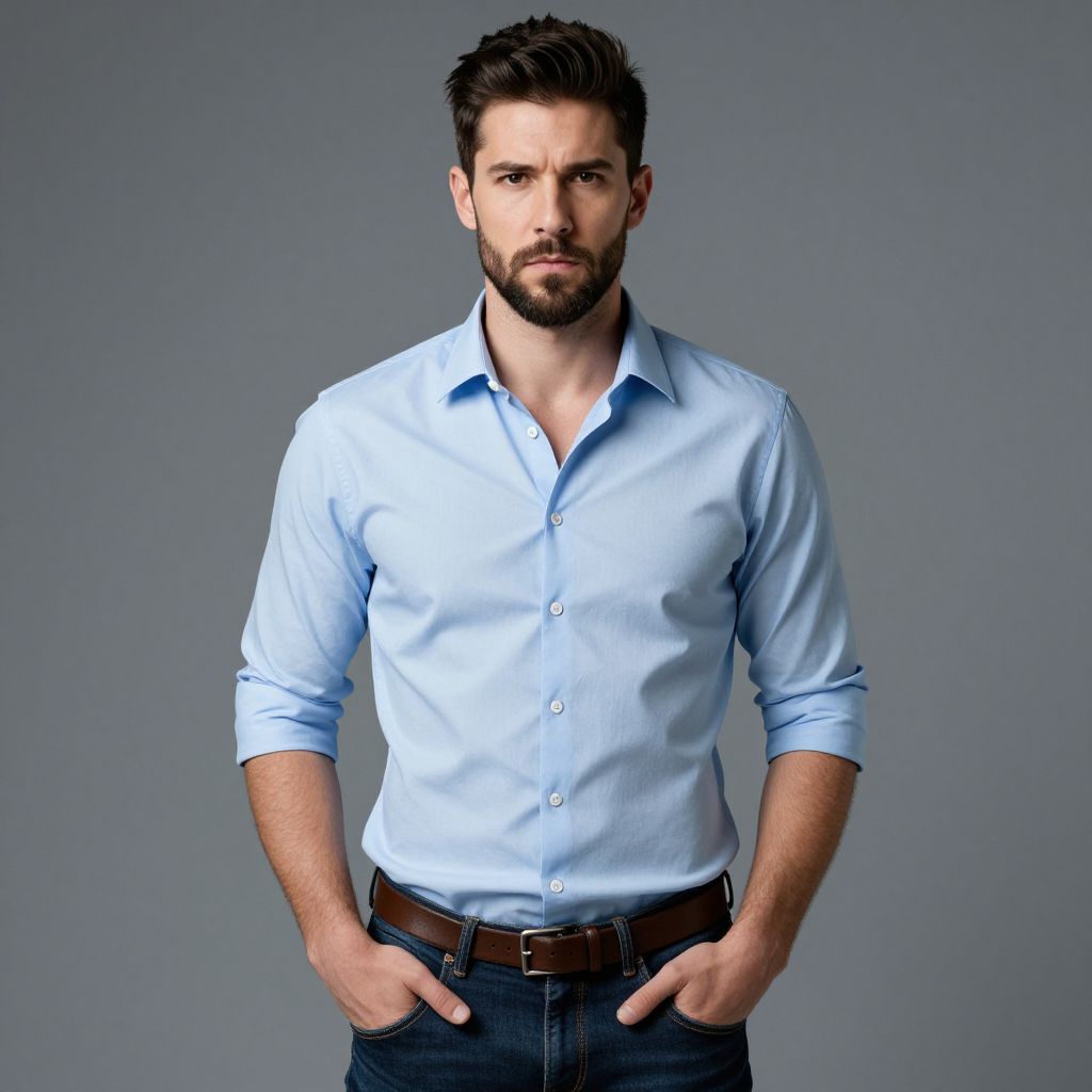 Photograph of a handsome, white man with a neatly trimmed beard and short, dark brown hair. He has a serious expression and is standing against a plain gray background. He is wearing a light blue, long-sleeved button-up shirt with the sleeves rolled up to his elbows, and dark blue jeans with a brown leather belt. His hands are casually tucked into his jeans' pockets. The lighting is even, highlighting his muscular build and the crisp fabric of his shirt. The overall style is modern and clean.