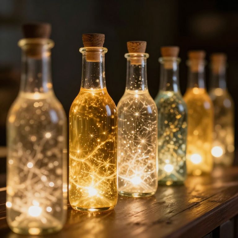 Photograph of six clear glass bottles with cork stoppers, arranged in a row on a wooden surface. Each bottle contains glowing fairy lights, creating a warm, golden light that illuminates the surrounding area. The bottles vary in shape and size, with some being shorter and rounder, while others are taller and more cylindrical. The background is dark, contrasting with the bright, warm glow of the lights inside the bottles. The fairy lights create sparkling, star-like effects within the glass, enhancing the magical, ethereal ambiance of the scene. The wooden surface has a rustic texture, adding to the cozy, vintage feel.