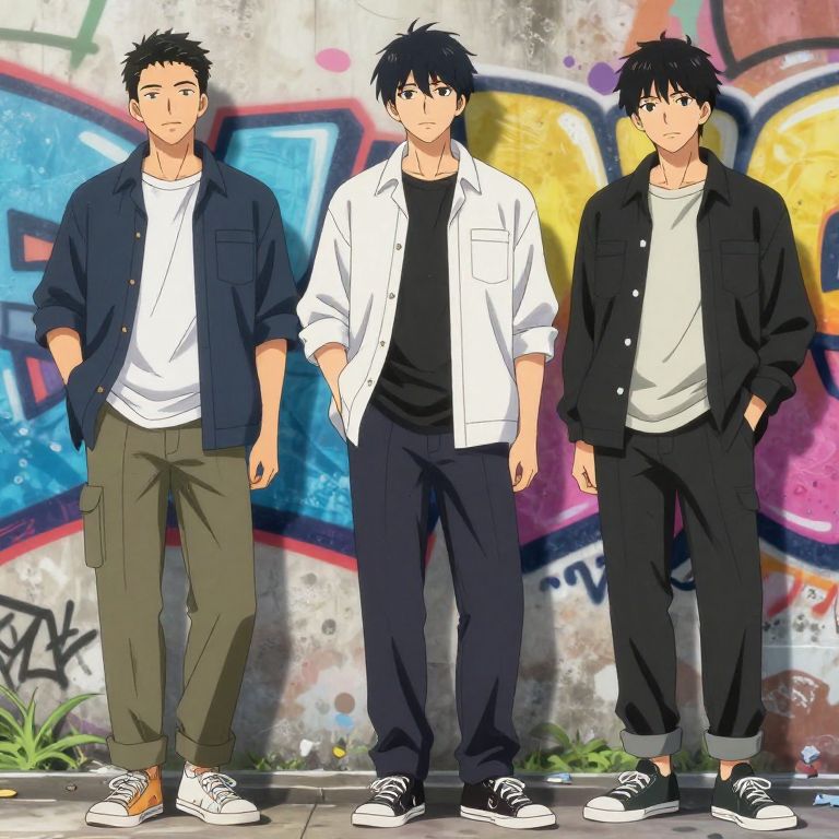 Anime-style drawing of three black-haired, brown-eyed men in casual clothes standing against colorful graffiti wall, wearing different jackets and pants.