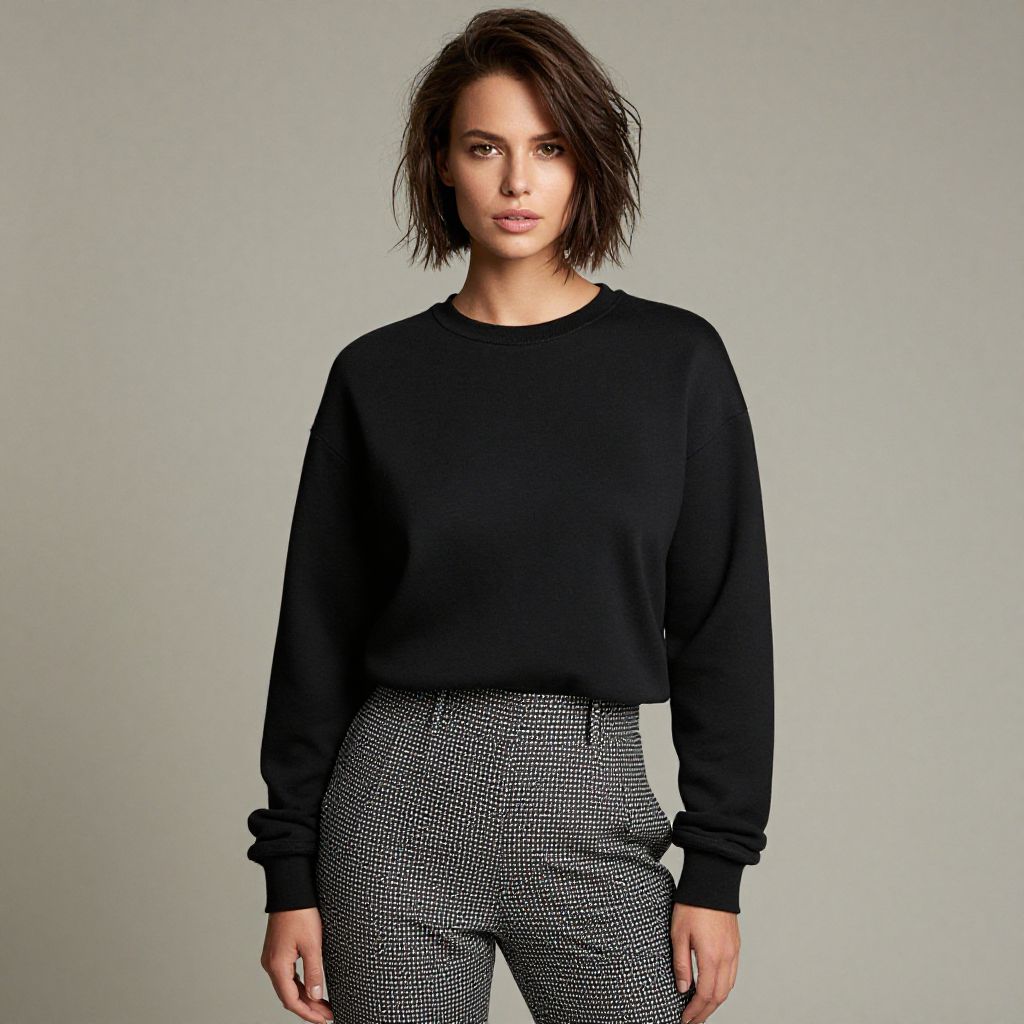 "Woman, casual chic, black crewneck sweatshirt, long sleeves with banded cuffs, patterned trousers in black and white, tapered fit, high waist, short messy hairstyle, neutral studio background.. Sexy. Pretty face and beаutiful eyes. Big breasts."