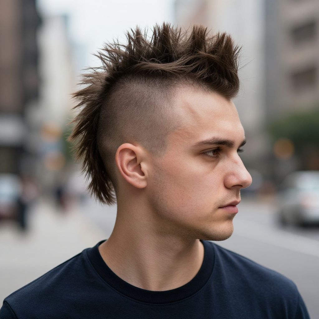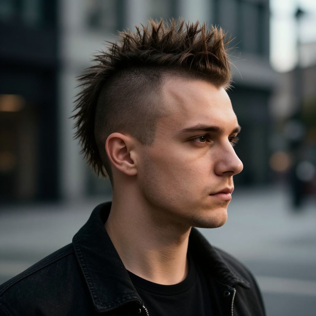 Classic Mohawk, fit european man, realistic street photography, dynamic composition, natural sunlight, high contrast, urban cityscape background, detailed facial expression, professional grooming, high resolution, 8k, 16:9 aspect ratio