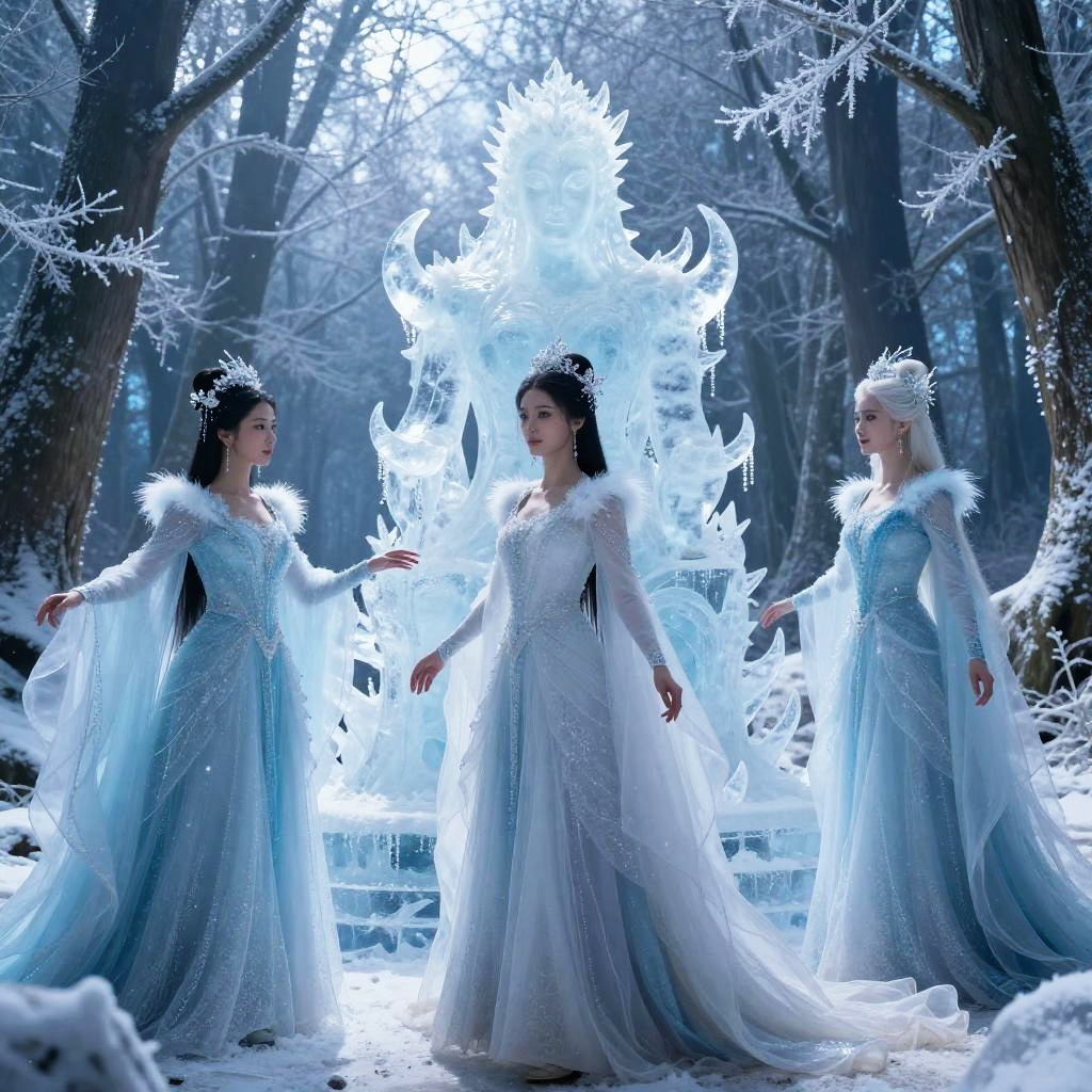 Female characters with ice powers creating massive ice sculptures in a mystical forest, ethereal light filtering through frosty trees, elegant flowing garments, magical realism style