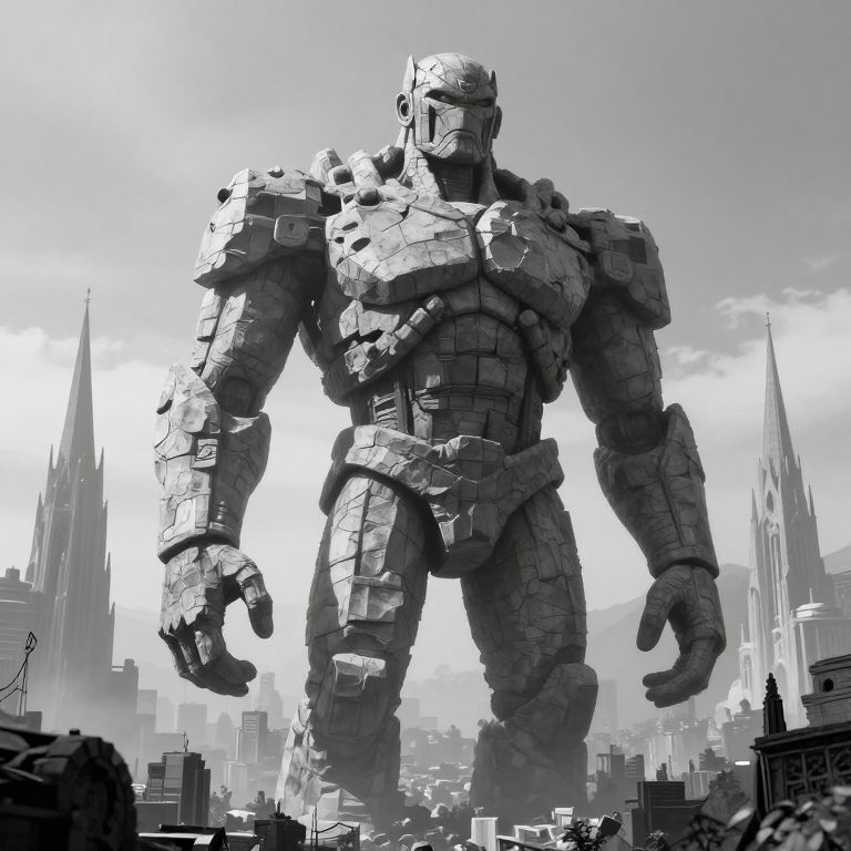 This is a black-and-white digital drawing of a massive, blocky, humanoid robot standing in a cityscape. The robot's armor is composed of angular, segmented plates with a rugged texture, giving it a stone-like appearance. Its head is featureless, and its hands are clenched into fists. The background features tall, spire-like buildings, some partially destroyed, with smaller buildings scattered around. The sky is bright with some clouds. The robot dominates the scene, towering over the city, which appears to be in ruins. The style is reminiscent of pixel art, with a high-contrast, grayscale color palette.
