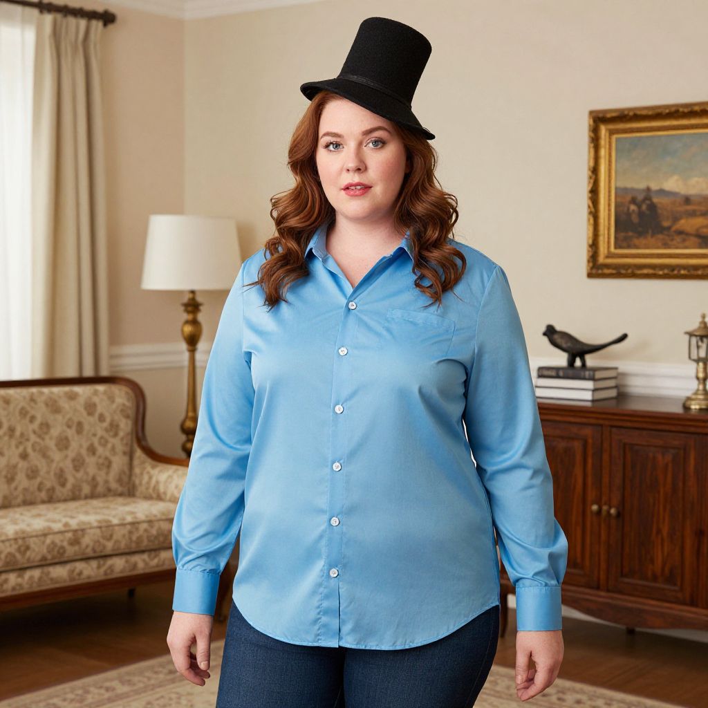 Photograph of a plus-sized woman with fair skin and wavy brown hair, wearing a black top hat and a light blue button-up shirt, standing in a well-lit living room. She has blue eyes and a neutral expression. She is also wearing dark blue jeans. The background includes a cream-colored sofa with patterned upholstery on the left, a wooden side table with a white lamp on the left, and a wooden cabinet with a black bird sculpture and a framed painting on the right. Beige curtains are partially visible on the left. The room has a classic, cozy decor.