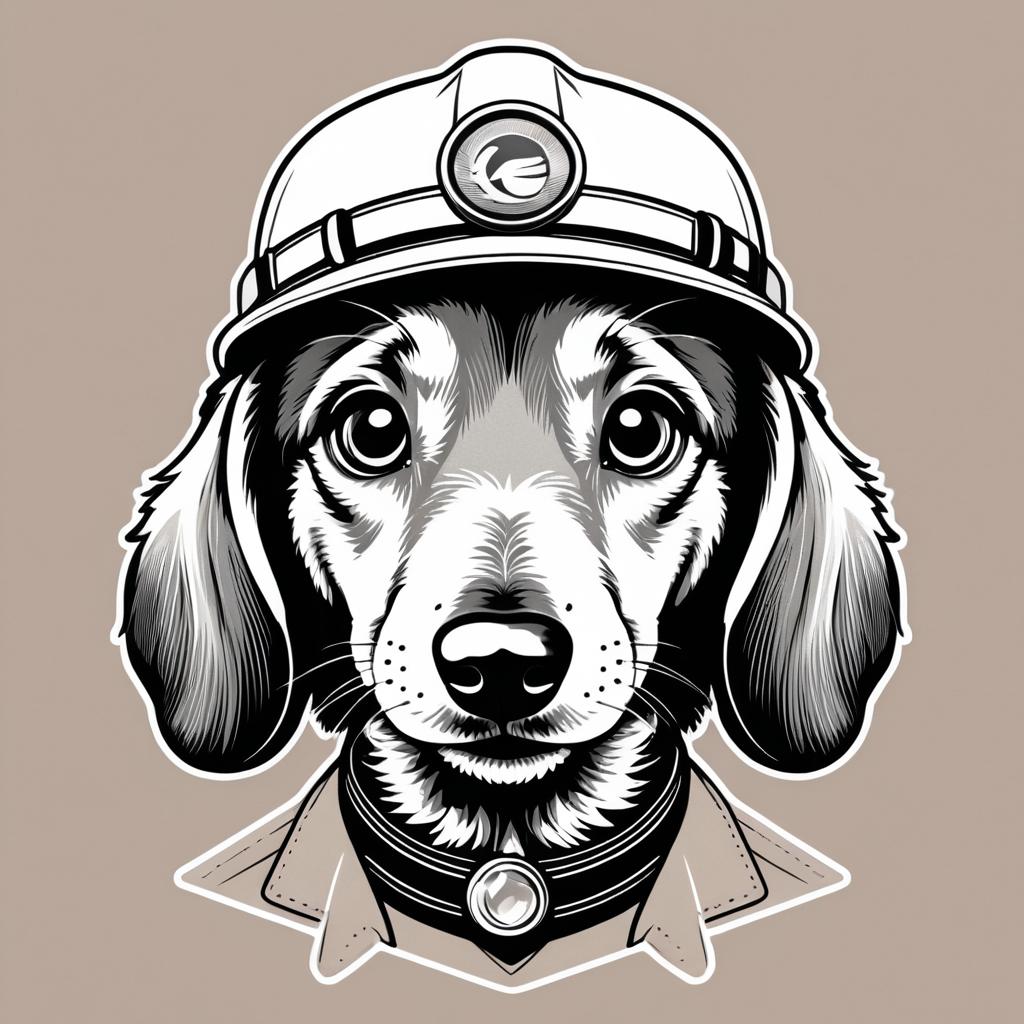 Black and white detailed digital illustration of a dachshund dog wearing a miner's helmet with a headlamp against a circular starry night background with mountains. The dog is depicted lying down with expressive eyes and a collar, emphasizing a mining theme.