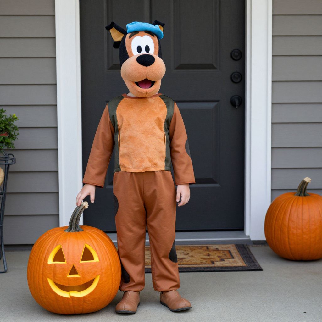 Photograph of a person in a Pluto the Dog costume standing in front of a black door with white trim. Pluto's costume is orange with brown pants and a blue headband. The person holds a large, carved pumpkin with a smiling jack-o'-lantern face in their right hand. Two more pumpkins are on either side of the door. The house has gray siding, and a small potted plant is visible on the left. The door has a circular doorknob and a welcome mat. The costume and pumpkins suggest a Halloween theme.