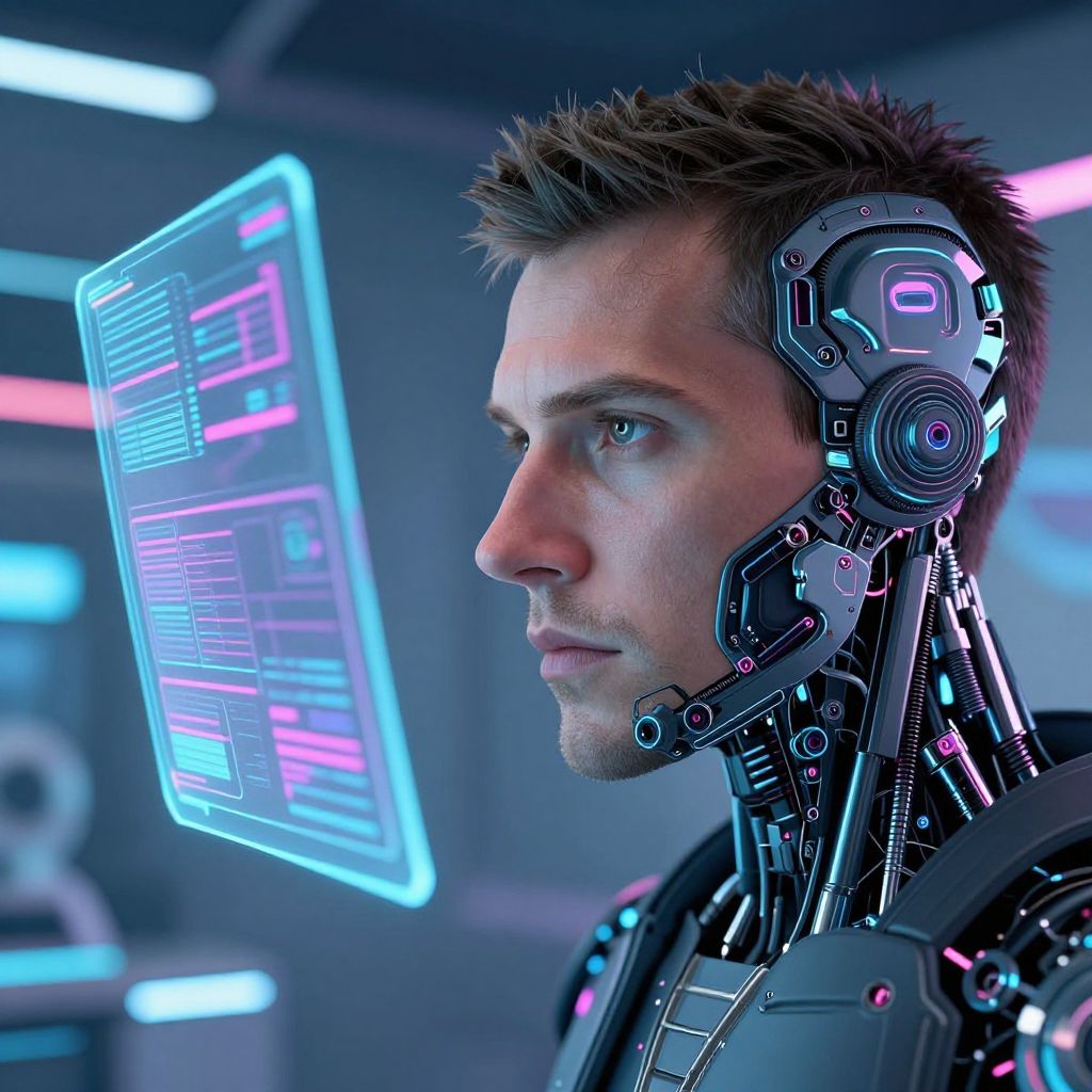 A photograph-style CGI image depicts a Caucasian man with short, spiked brown hair and blue eyes, wearing a futuristic cybernetic suit with glowing blue and pink lights. His left ear and neck are adorned with intricate, high-tech cybernetic components. He is looking intently at a holographic screen floating in front of him, displaying colorful, neon-lit data. The background is a dimly lit, metallic industrial room with blurred blue and pink neon lights. The man's expression is focused and contemplative. The overall aesthetic is sci-fi and high-tech.