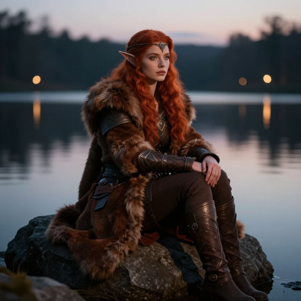 A fantasy scene featuring a warrior with striking wavy red hair wearing intricate leather armor, standing on a rocky cliff overlooking a vast enchanted forest at dusk. The glowing orange sunset mirrors the vibrant hues of the hair, creating a heroic and mystical vibe.