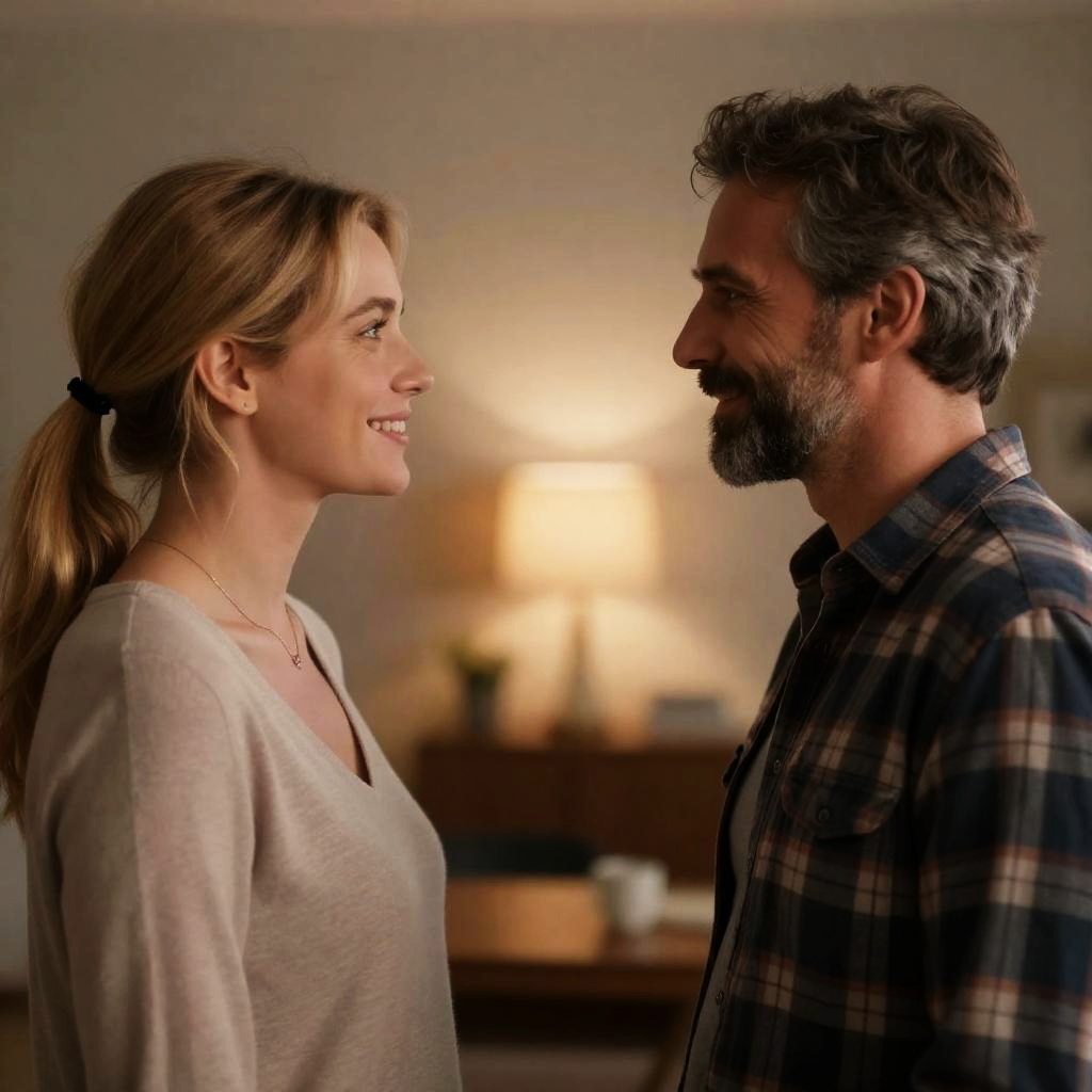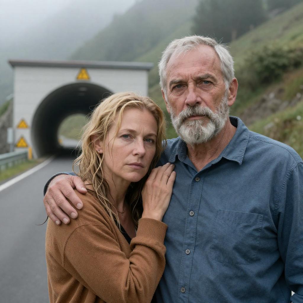 Photograph of an older bearded man carrying a blonde woman with curly hair in a brown fleece jacket and blue jeans on a foggy, empty road. The man wears a blue shirt and dark pants. The woman's legs are wrapped around his waist. Fog obscures the background, creating a moody, isolated atmosphere. The man's hands grip the woman's waist and thigh. The road is wet and stretches into the distance.