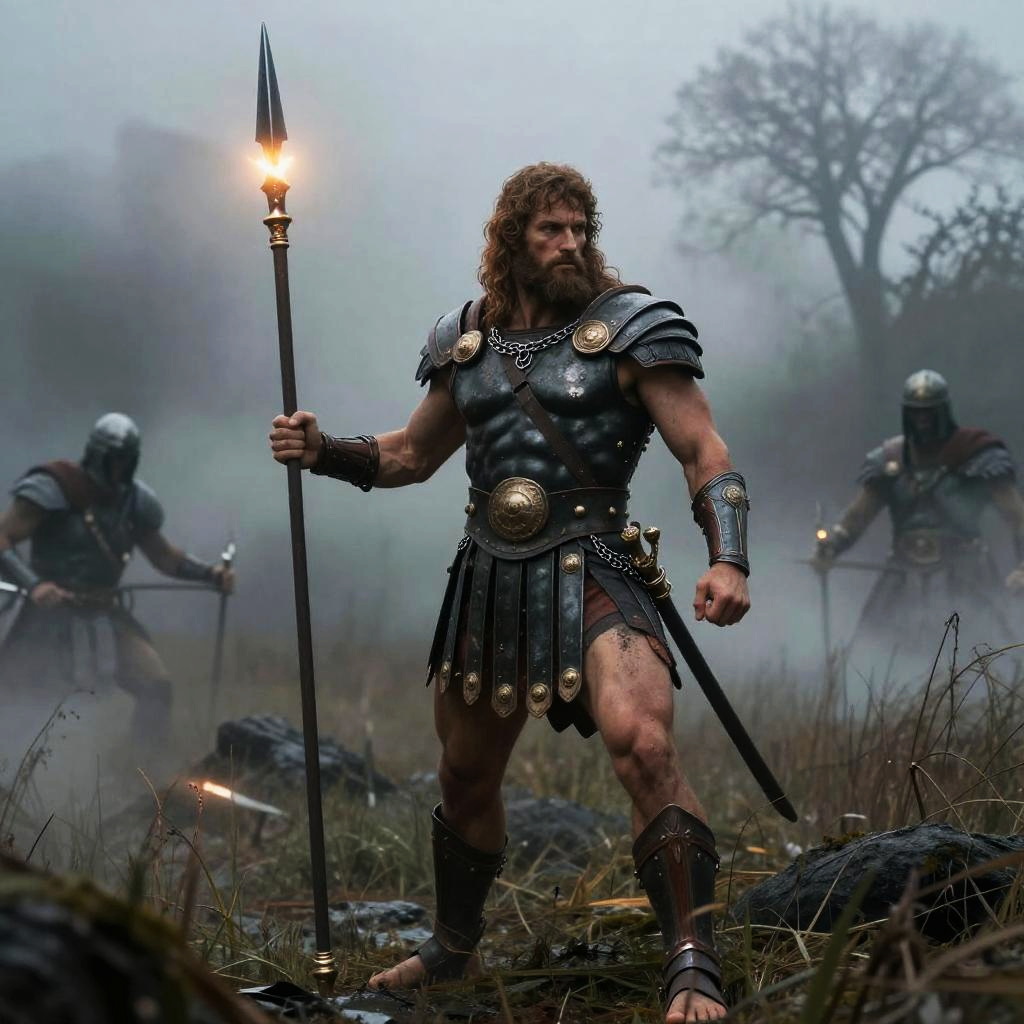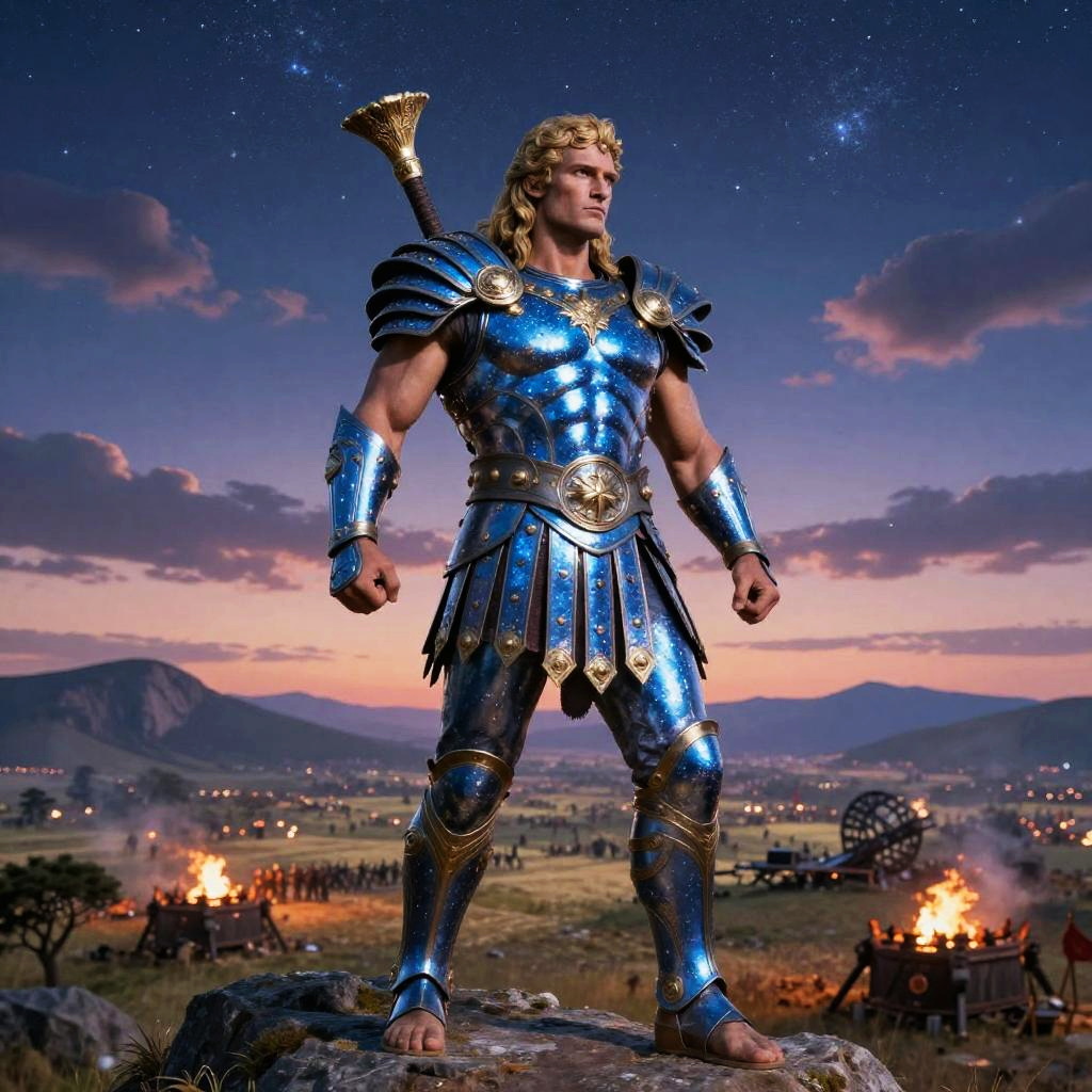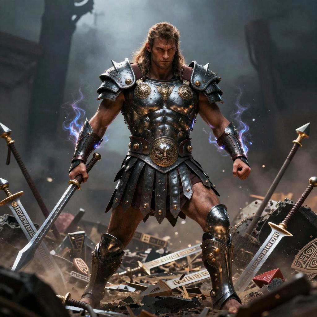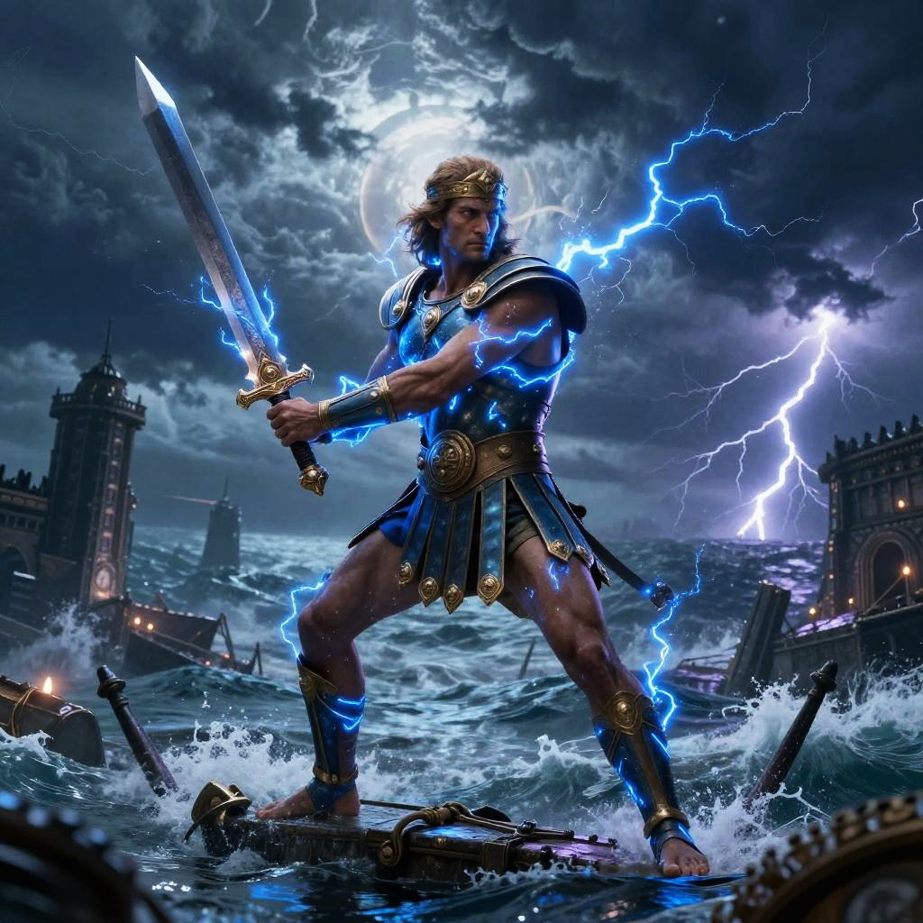 Ares – God of war, depicted as a mythical general wreathed in electric blue light, wielding a double-edged sword, surrounded by a sunken city beneath stormy seas, with lightning striking the watery horizon.