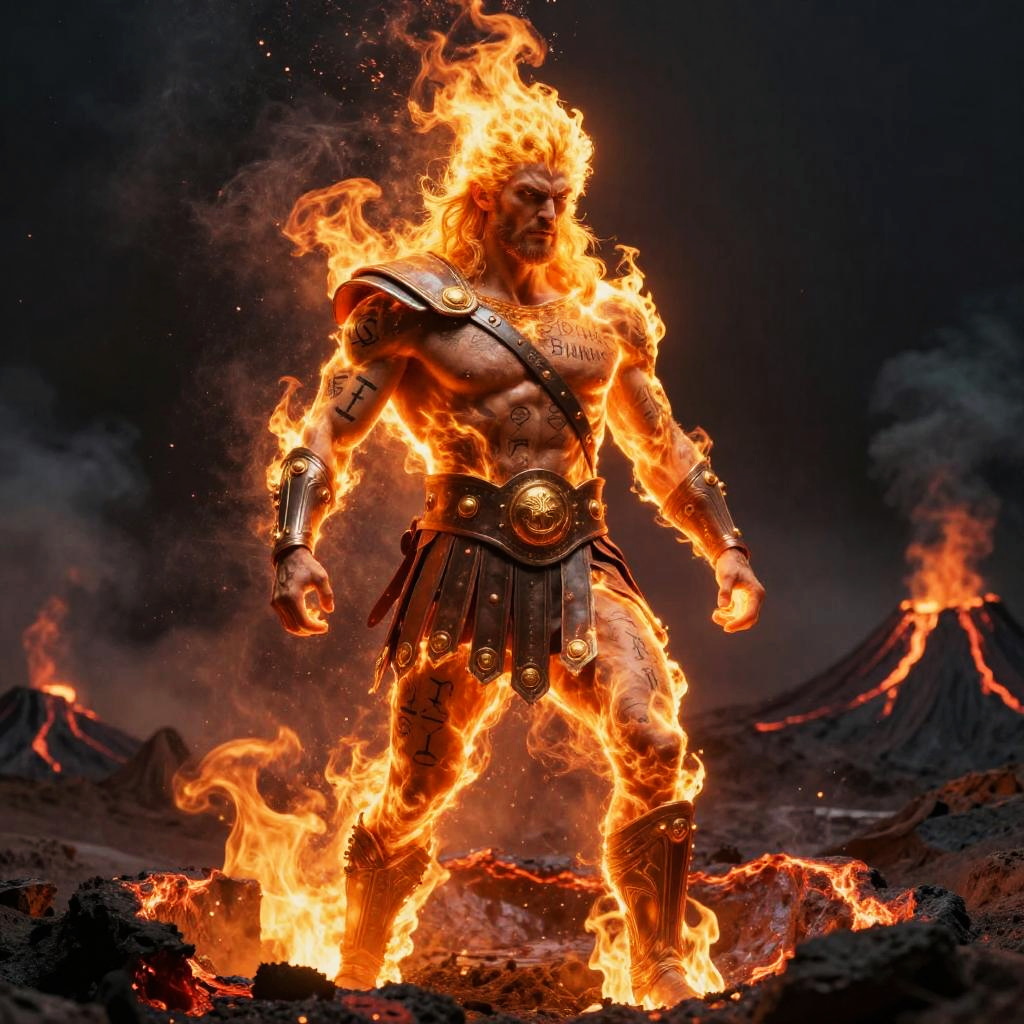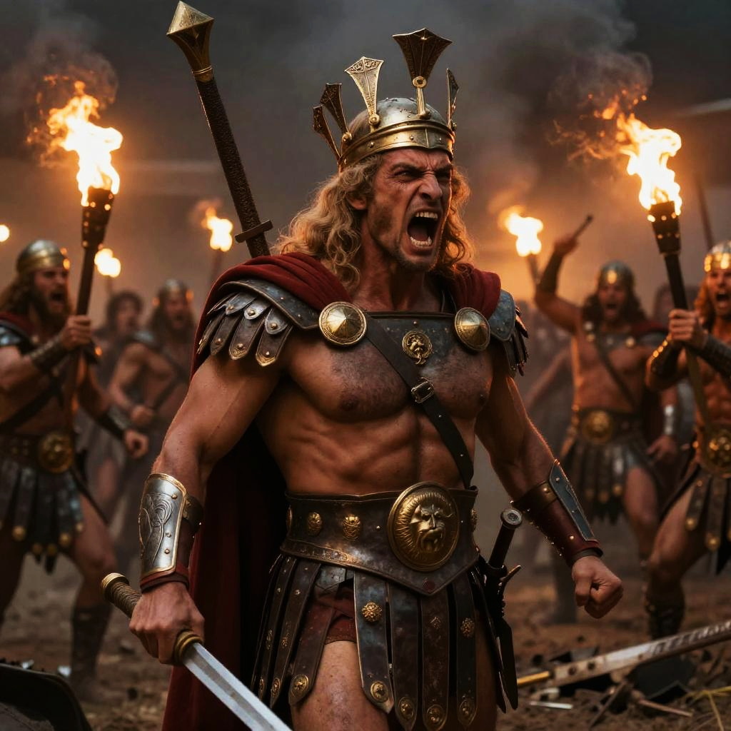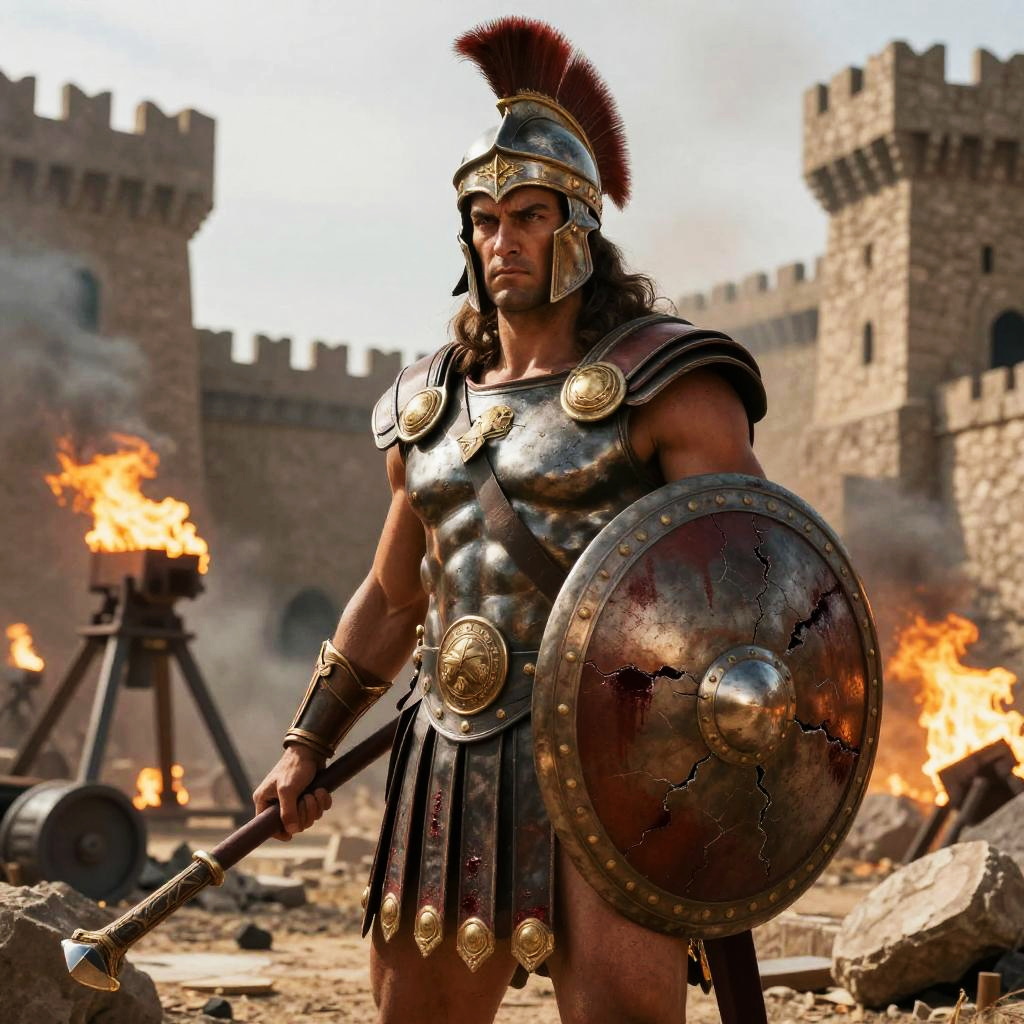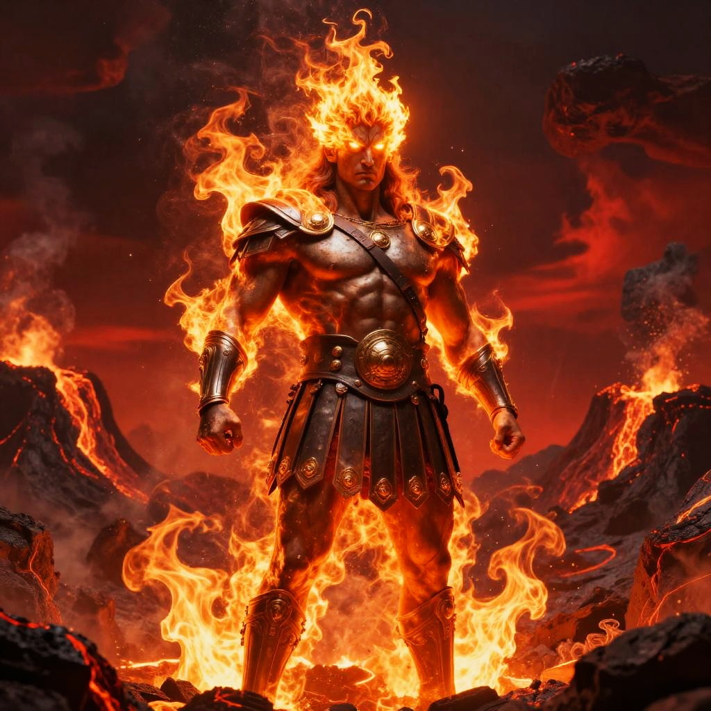 Ares – God of war, depicted as a mythical general wreathed in electric blue light, wielding a double-edged sword, surrounded by a sunken city beneath stormy seas, with lightning striking the watery horizon.