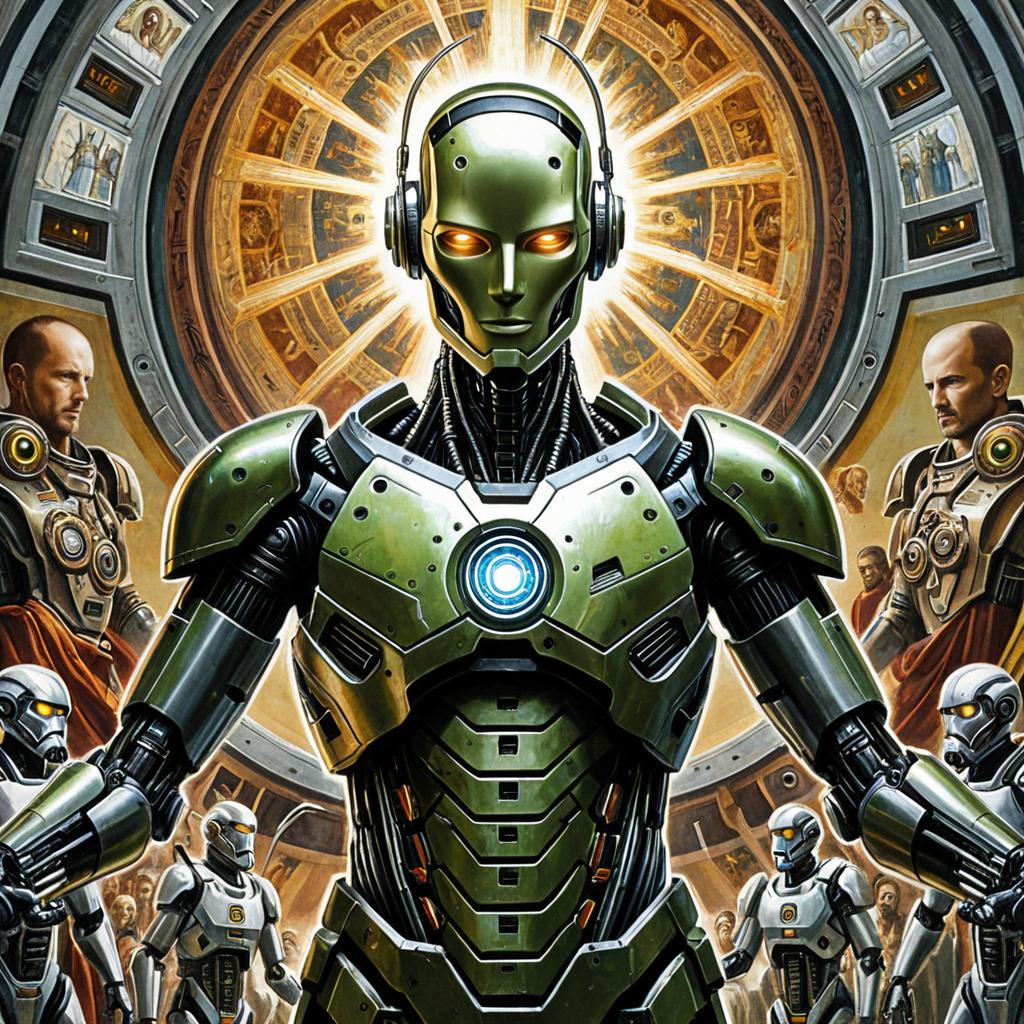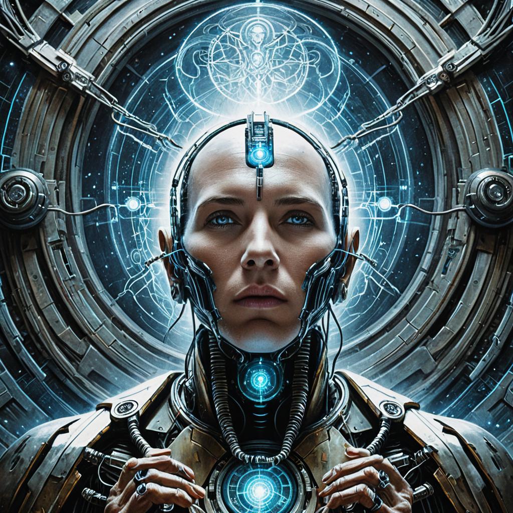 Hyper-detailed fresco painting conveying faith and repulsion, depicting a psychic emissary in the year 2479 with neural interface implants, cyborgs and mortals intertwined, ultra-realistic, transcendence and control theme, futuristic yet deeply humanistic