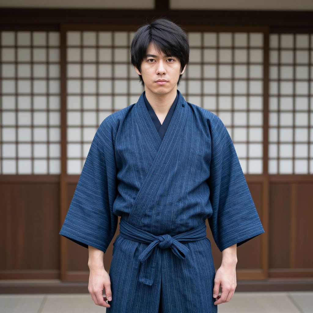 Photograph of a young Asian man with short, black hair, wearing a navy blue, textured kimono with a tied belt. He stands centered in front of a traditional Japanese wooden sliding door with grid patterns and frosted glass panels. His expression is neutral, and he has a fair skin tone. The background is slightly blurred, emphasizing the subject. The kimono's fabric appears thick and slightly wrinkled, adding texture to the overall composition. The lighting is natural, highlighting his face and the fabric's details.