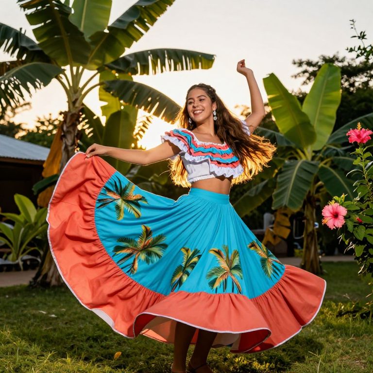 A young Colombian cumbia dancer with long brown hair and a joyful expression, dressed in a wide, flowing skirt in tropical colors such as coral, sky blue, and terracotta, performing in a tropical garden at sunset, surrounded by banana trees and blooming hibiscus, the golden light gilding her movements and the skirt fluttering in the warm breeze.