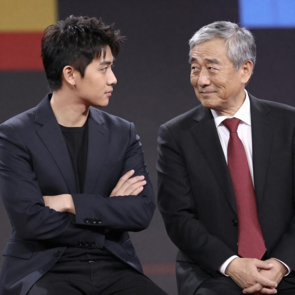 Photograph of a young man with short black hair in a black hoodie, looking up at an older man with gray hair in a navy blue military-style jacket adorned with a badge. The older man gently touches the younger man's shoulder, creating an intimate, respectful connection. Dark green foliage forms the blurred background.