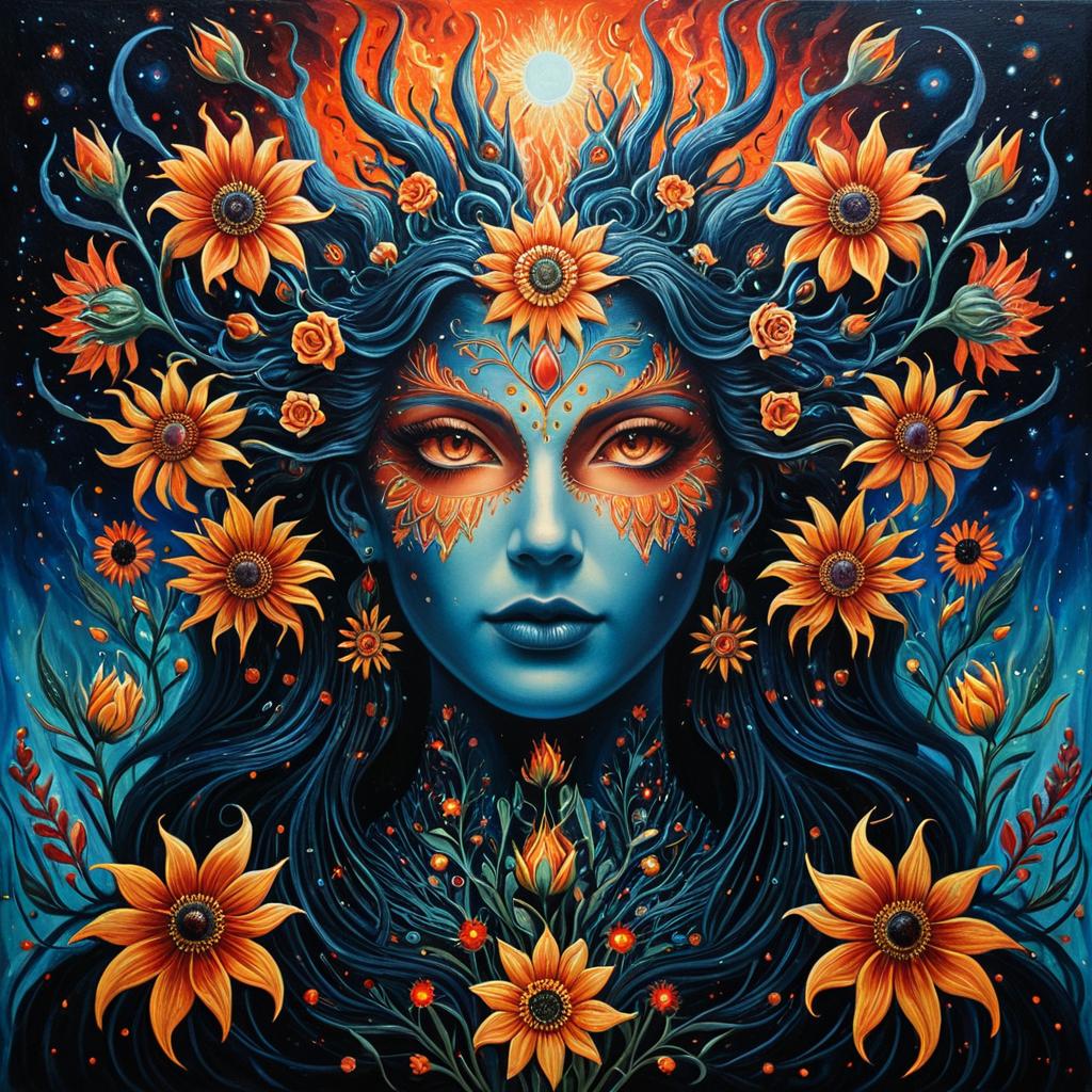 A surreal digital painting of a young man with flawless skin and sharp features, adorned with a vibrant crown of orange lilies intertwined with green leaves. The background swirls with rich blues, purples, and warm orange hues, creating a mystical atmosphere. His gaze is intense, and intricate face paint highlights his forehead and cheekbones, enhancing the fantasy essence of the artwork.