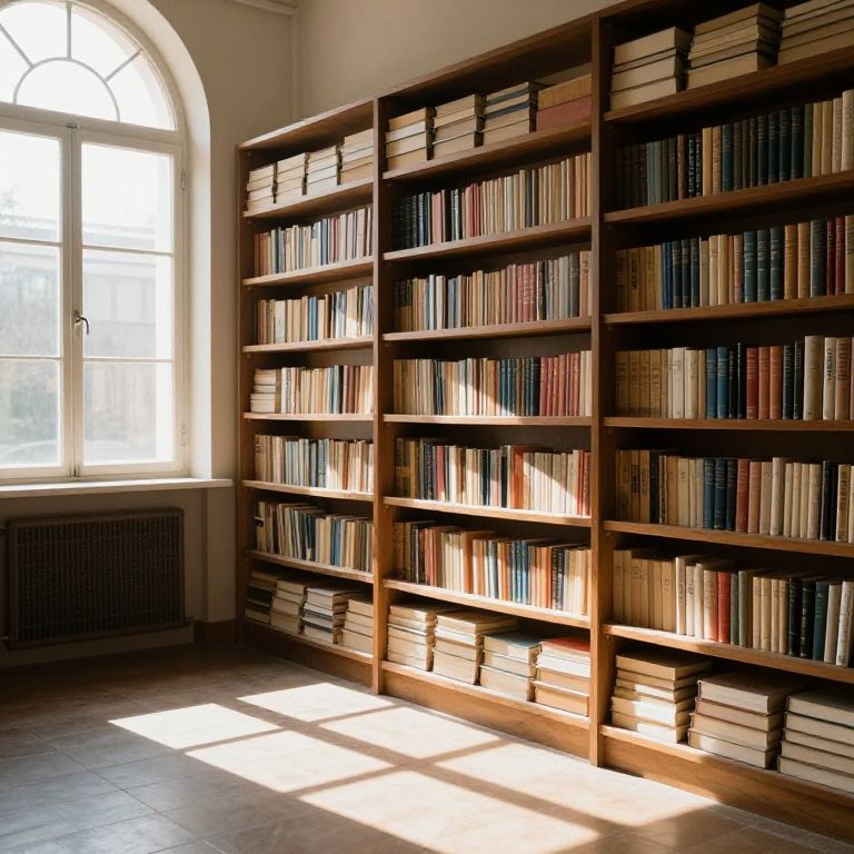 Photograph of a sunlit library room. Dominating the right side, tall wooden bookshelves are filled with an array of books, their spines in varied colors. Sunlight streams through a large, arched, white-framed window on the left, casting bright, geometric shadows on the tiled floor. The shelves are organized, with books neatly aligned, and the lower shelves have books stacked horizontally. The room has a warm, inviting atmosphere, with the natural light enhancing the wooden texture of the shelves and the colorful book spines.