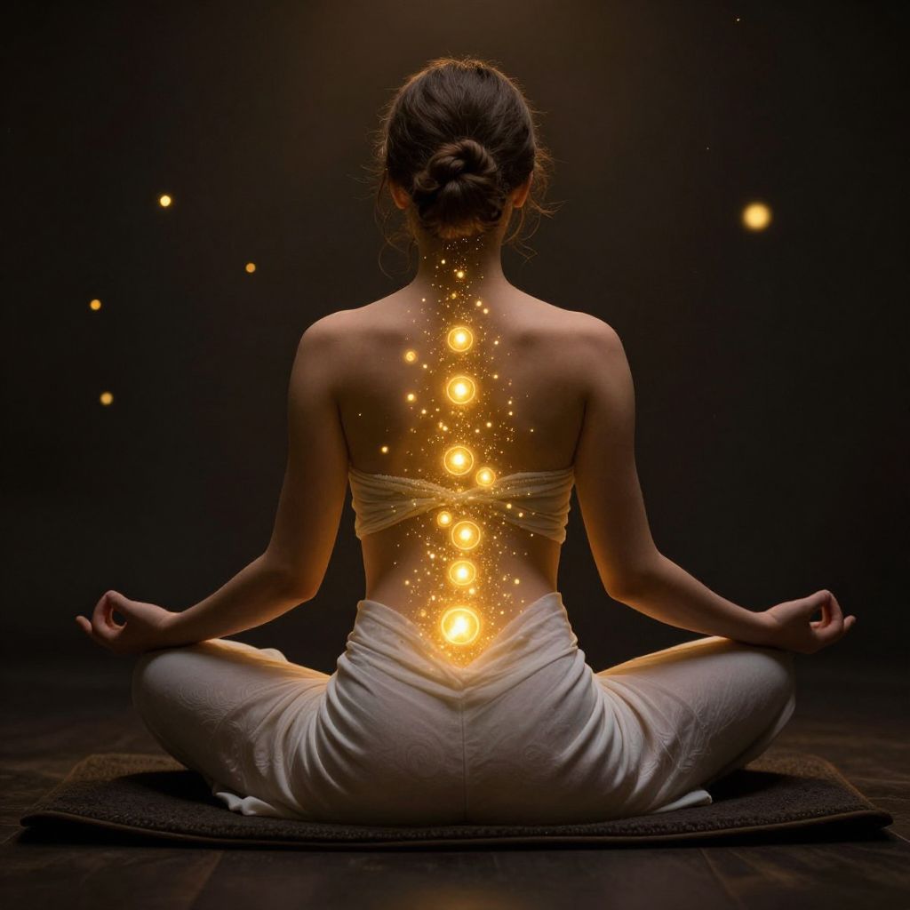 Photograph of a woman with medium brown skin, dark hair in a bun, sitting cross-legged in a meditative pose on a dark brown background. She wears beige, strapless top and pants. Her back faces the camera, illuminated by a glowing, vertical line of orange and yellow orbs running down her spine, with small sparks trailing off to the right. Her hands rest on her knees with fingers in a mudra. The image has a mystical, spiritual vibe, emphasizing inner light and energy. The overall tone is warm and serene.