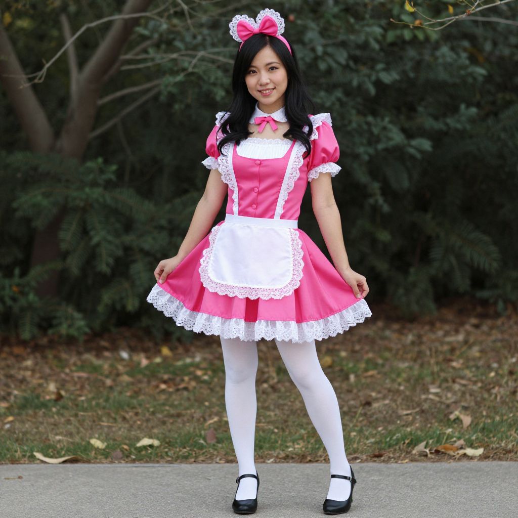 Asian woman in pink maid costume with white lace trim, white tights, black shoes, and pink bow headpiece, standing outdoors. Photographic image