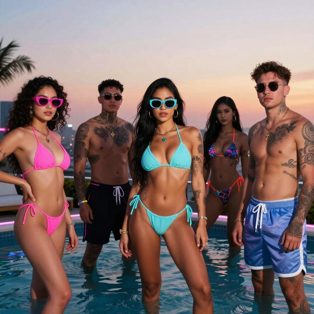 Photograph of four tattooed, sun-kissed individuals in vibrant bikinis and swim trunks, standing in a pool at sunset, wearing sunglasses